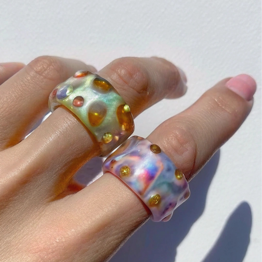 Recraft/Promt: a double ring (worn on two adjacent fingers) made of handmade glass and individual, crooked shape, bubble ring, textured rings untidy and bright, emphasizing individuality bubbly and puffed uneven shape and design abstract and of different shapes and textures
