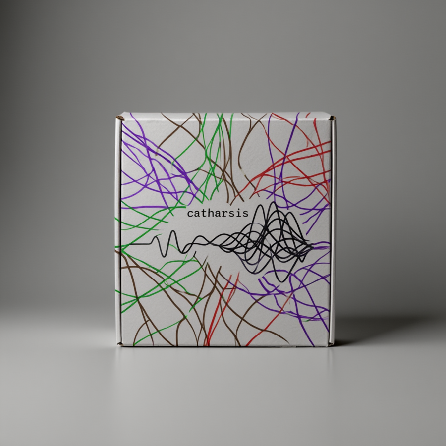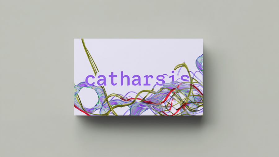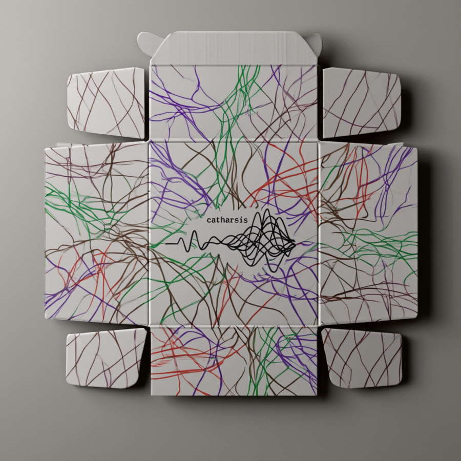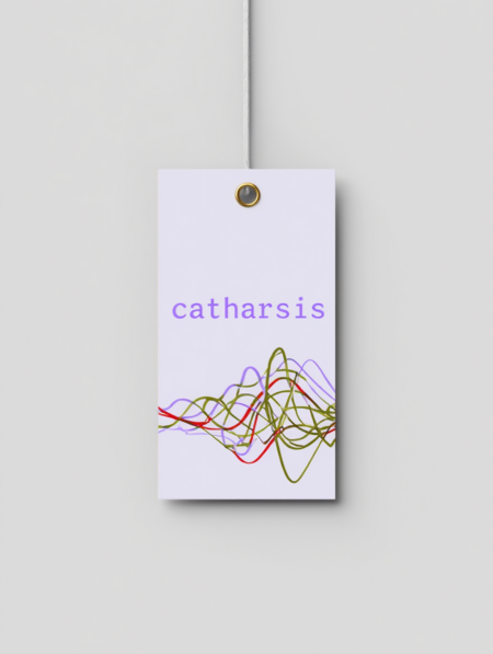ChatGPT/Promt: a logo of linear chaotic lines resembling an Electroencephalography, with the brand name «catharsis» written in a small monospaced font just above the center. The logo lines start in an arc from left to right, wrap around the elbows from above, overlapping each other periodically, starting with a more linear version and transitioning into a more chaotic version towards the left edge of the image. The logo does not overlap or superimpose, and the image is displayed on a transparent background.