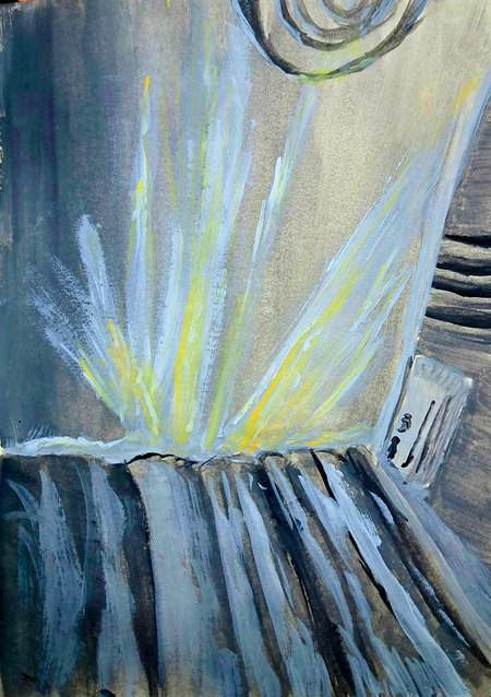 Для меня повседневностью является смена времени суток. Я часто наблюдаю красивые рассветы, закаты и яркое солнце. От этих явлений природы падает свет с тенью, также отражение дополняют это зрелище. Итак, мой зин — это изображение времени суток переданное через падающий свет и тень. Моя работа построена на основе контраста, для выделение главных элементов. Также в работе присутствует кольцевая композиция.