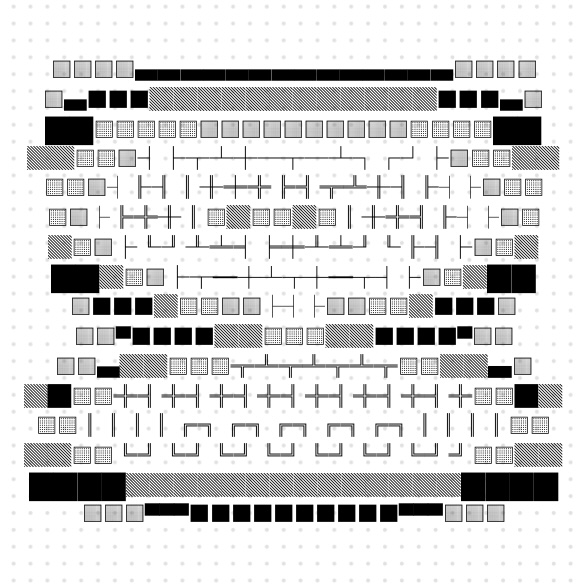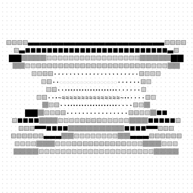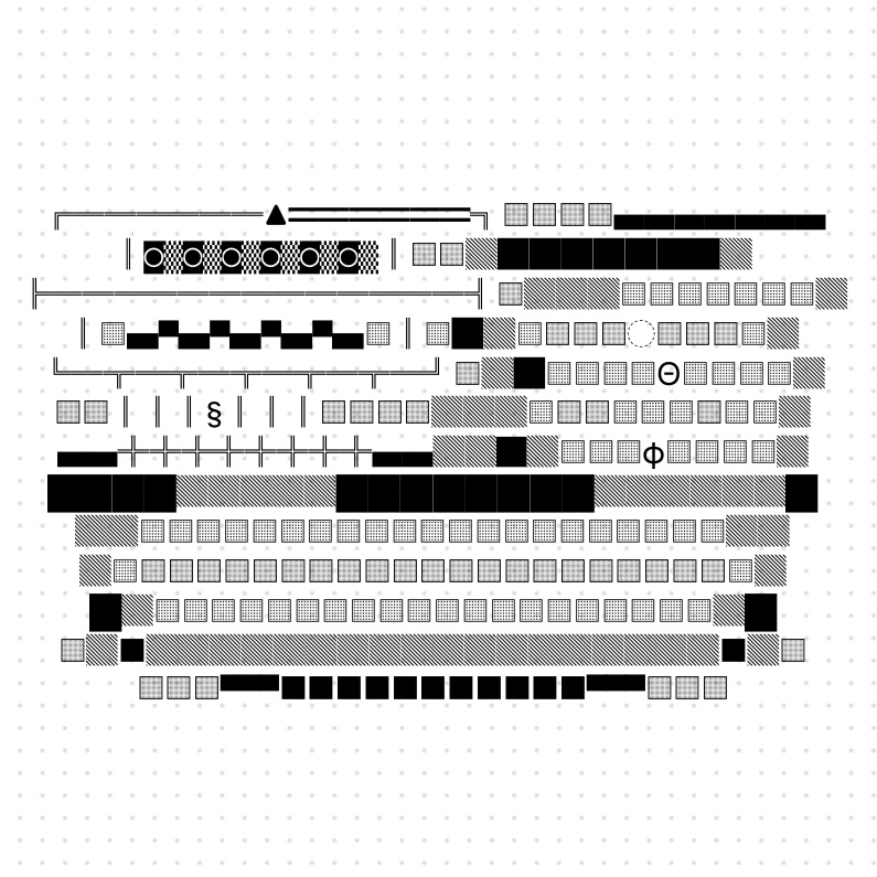 Слух становится спиралями из ▓ и резонансных решёток, вкус — взрывом концентрических кругов ◙, а осязание — линиями, имитирующими нейронные импульсы. Без антропоморфных образов работы раскрывают сенсорику как физику процессов: обоняние — это танец частиц ∙∙◦•, зрение — игра преломлений ◊ и сетей ║.