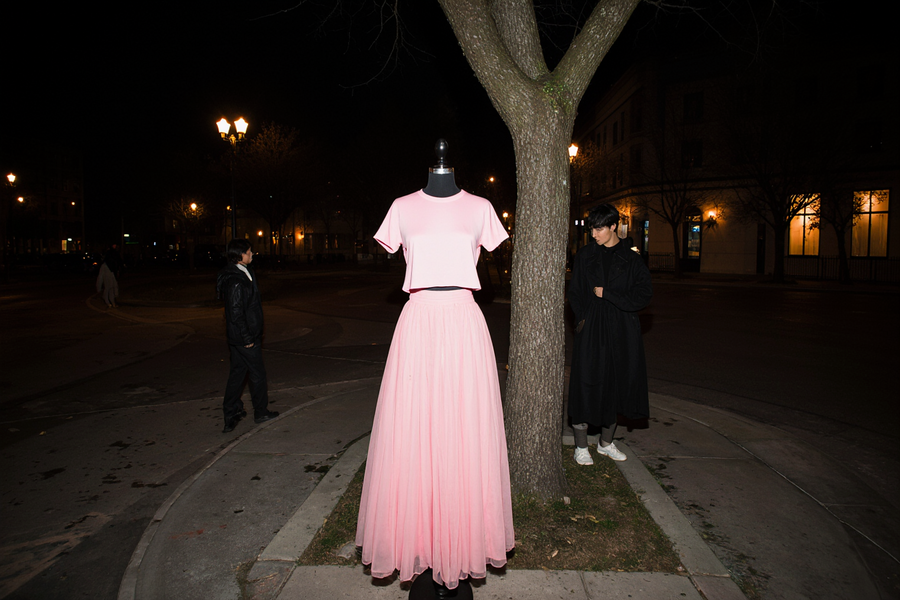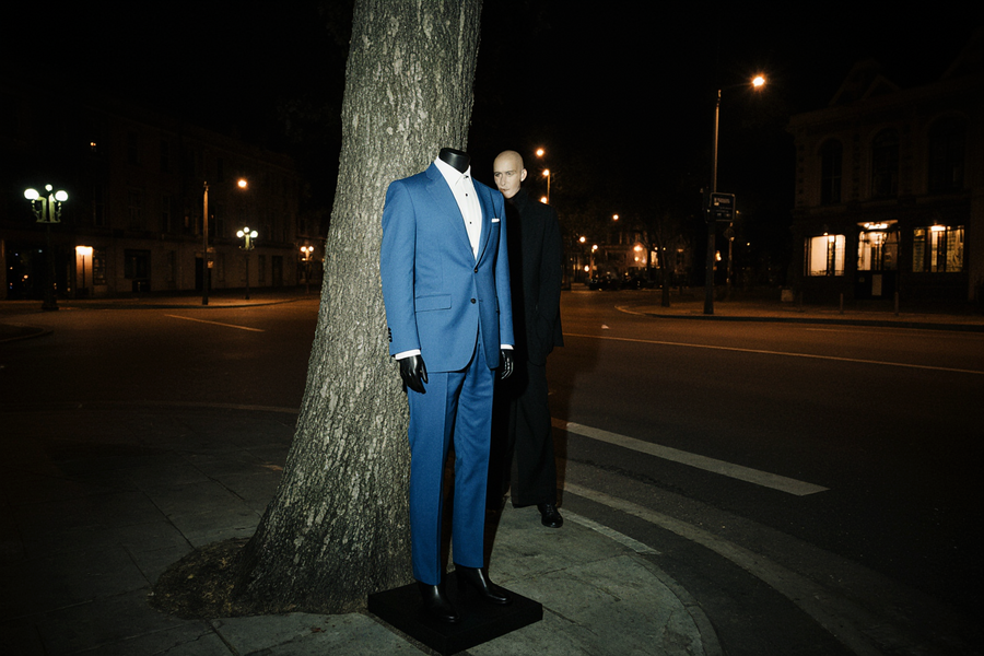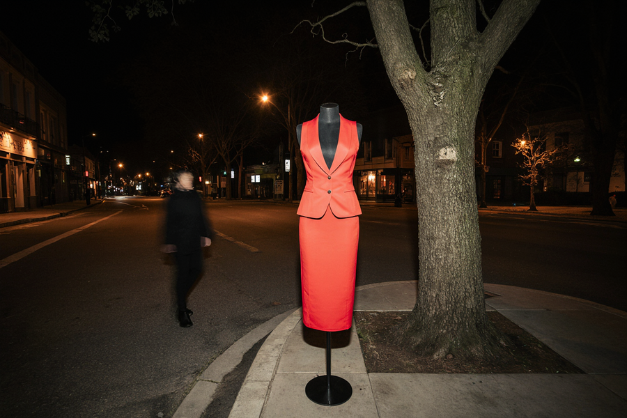 «A surreal nighttime photograph showing a bright red vest and skirt displayed on a black mannequin under a spotlight near a large tree. Behind the mannequin, a person dressed in black stands partly hidden in the shadows, blending into the dark background. The scene is illuminated dramatically, creating strong contrast between light and darkness. The background features a dimly lit street and buildings with warm orange lights, adding a mysterious and cinematic atmosphere.»