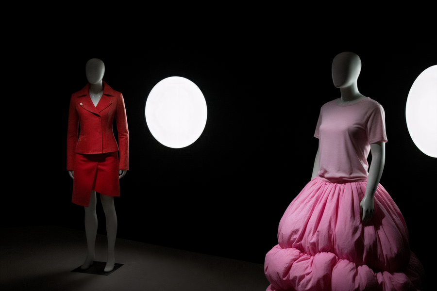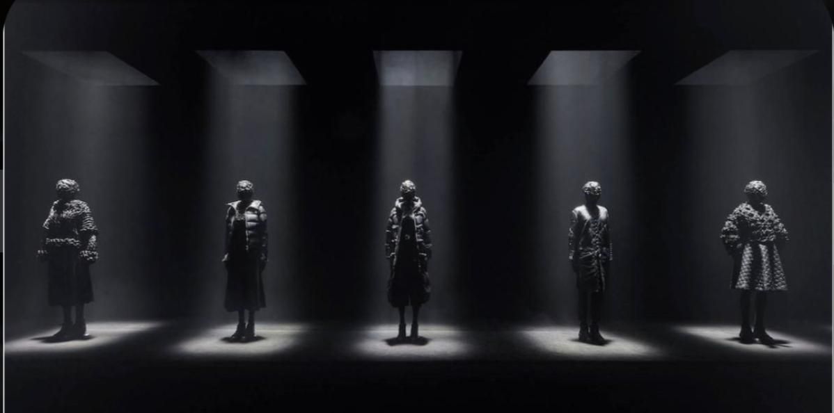 (собранный по частям) image prompt: «A dark minimalist exhibition room with mannequins. The room has a modern, futuristic atmosphere with a clean and dramatic lighting setup. Four mannequins stand spaced evenly across the scene. The lights behind each mannequin create a halo-like glow, emphasizing their silhouettes against the deep black background. The floor is made of smooth reflective tiles, subtly capturing the light. The overall mood is cinematic, avant-garde, and fashion-focused a blend of high fashion photography, installation art, and futuristic design.»