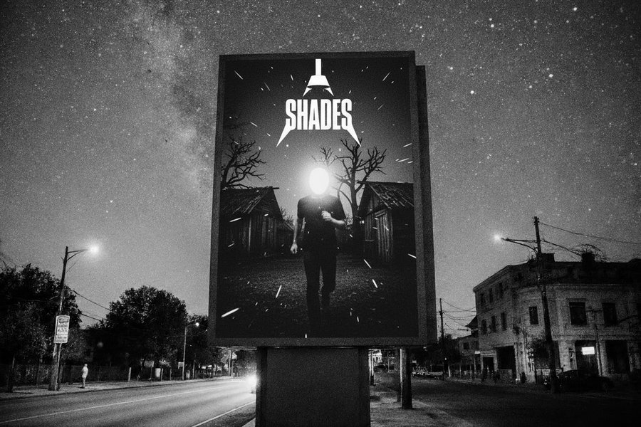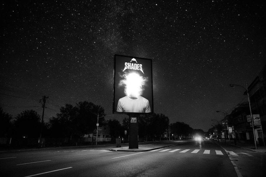 image prompt: «A surreal black-and-white night scene of an empty city street under a starry sky. In the center stands a large glowing billboard showing a faceless person with a cloud of light and smoke instead of a head, and the word „SHADES“ written above in bold letters. The billboard illuminates the surroundings with a soft, eerie glow. The atmosphere is cinematic, mysterious, and dreamlike, blending elements of urban isolation and cosmic wonder, evoking a sense of existential reflection.»