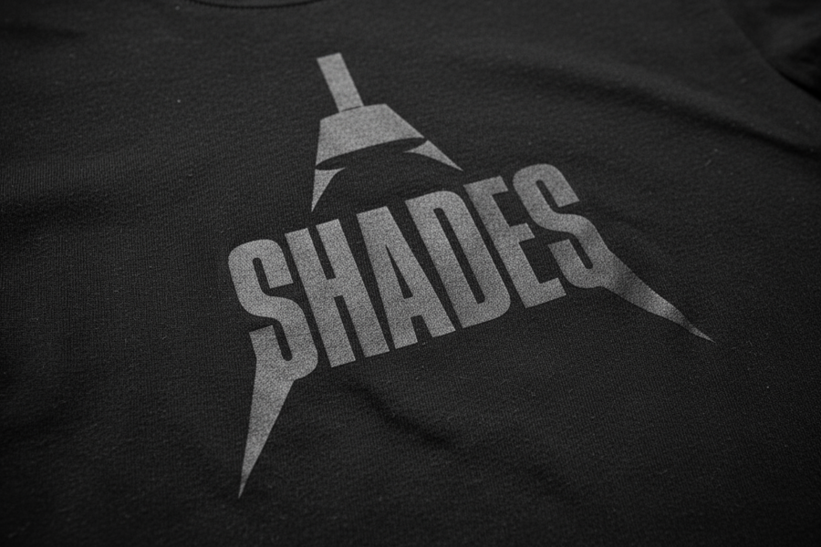 image prompt: «A minimalist black-and-white logo design featuring the word „SHADES“ for aggressive brand of clothes. Above the text is a stylized hanging lamp icon with light rays of the logo composition. The overall style is clean, modern, and graphic, with strong contrast and a sense of illumination suggested by the design.»