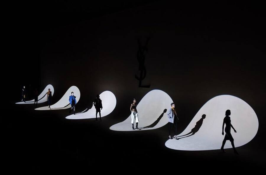 В идею проекта плотно заложено использование светового луча как прикованного к одежде внимания. Поэтому и пространство бренда крутится вокруг подсвеченных образов на манекенах.