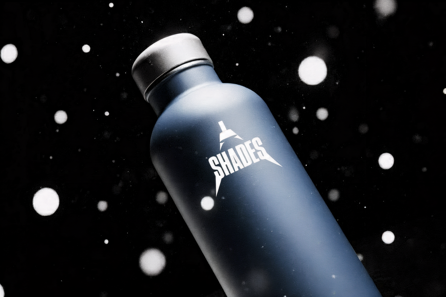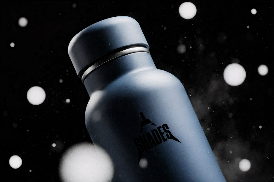 image prompt: «A close-up, high-contrast product photograph of a sleek matte dark blue metal water bottle with a silver cap, positioned diagonally against a dramatic black background filled bright white light spots float through the dark air, resembling snow or dust in the air. The bottle features a bold white logo that reads „SHADES“, accompanied by a minimalist geometric emblem above the text. The lighting is cinematic and moody, emphasizing the smooth texture and curvature of the bottle while creating subtle reflections on its metallic surface. The overall aesthetic is modern, premium, and mysterious, with a sense of depth and motion, ideal for branding, lifestyle, or advertising design.»
