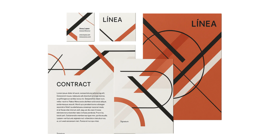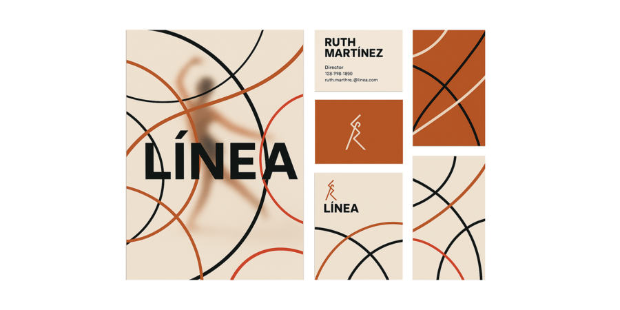 create a coordinated set of printed brand materials for contemporary dance brand «LÍNEA» (keep acute on Í). include in one image: business card (both sides), envelope, contract paper (A4 format), and folder (A4 format). overall visual language derived from the LÍNEA identity — inspired by Rodchenko and Bauhaus geometry of motion. the compositions use abstract line gestures and diagonal rhythm based on the brand’s logo; elegant balance between strict structure and organic motion. Color palette: terracotta A64B36, graphite 1A1A1A, warm gray E5E1DC, pure white FFFFFF, optional accent red D32027. backgrounds may vary: white, warm gray, or soft terracotta — depending on contrast. typography: modern geometric grotesk «LÍNEA» and simple layout grid with refined optical spacing. Mood: minimalistic, kinetic, architectural, intelligent. every element feels like part of one system. Design elements: — monoline arcs and diagonal strokes echoing movement; — subtle overlays of transparent terracotta shapes; — small typographic details aligned to grid; — no gradients, no 3D, no glossy mockups. presentation: all four printed items arranged neatly on a flat surface, top-view composition, editorial lighting, high-contrast, clean vector look.