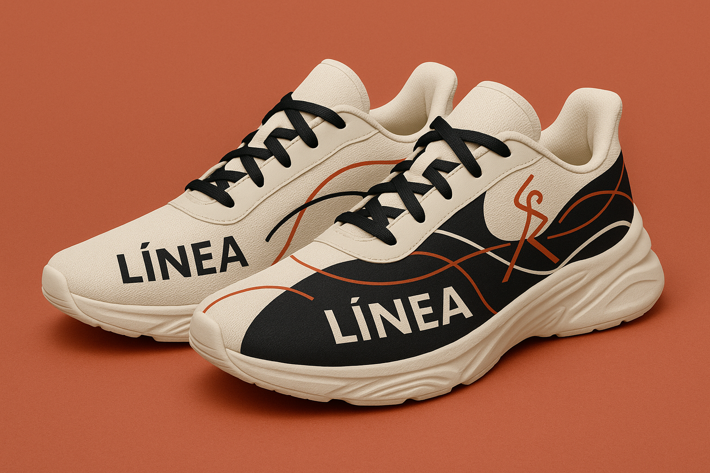 Pair of modern dance sneakers in cream and black tones placed on a terracotta surface. Smooth textile texture, black laces, and graphic linear pattern wrapping around the shoe in terracotta and ivory colors. Bold LÍNEA lettering on sides in black, balanced composition, minimalist aesthetic, soft daylight with warm highlights, clean shadows, sense of dynamic stillness.