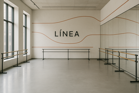 interior of contemporary dance school «LÍNEA» in Moscow — open minimalist hall with tall windows, polished concrete floor, mirrored wall, black ballet barres, subtle terracotta line graphics across walls. soft natural light, refined modern design, calm yet kinetic mood, editorial realism, no people, high-end architecture photography aesthetic.