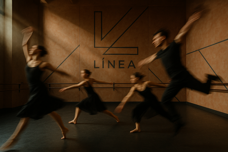 rehearsal hall of «LÍNEA» dance school in Moscow with dancers practicing — expressive motion blur, minimalist space, terracotta and graphite palette, geometric wall markings echoing the brand’s logo, cinematic light, dynamic realism, sense of energy and grace.