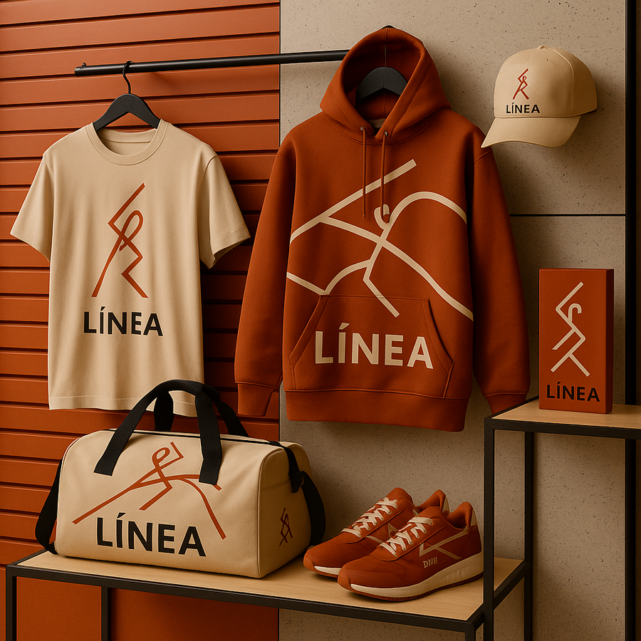 Modern dance school concept store interior in warm terracotta and concrete tones. Display of branded products: red-orange duffel bags with ivory LÍNEA logo, minimalist cream and terracotta T-shirts with monoline dancer gestures, and sneakers with linear graphics. Poster with the same gesture and typography on the wall. Soft daylight, warm shadows, people walking by in motion blur. Calm, elegant atmosphere that feels both artistic and real, no exaggerated lighting, no gloss — tactile materials and spatial balance.