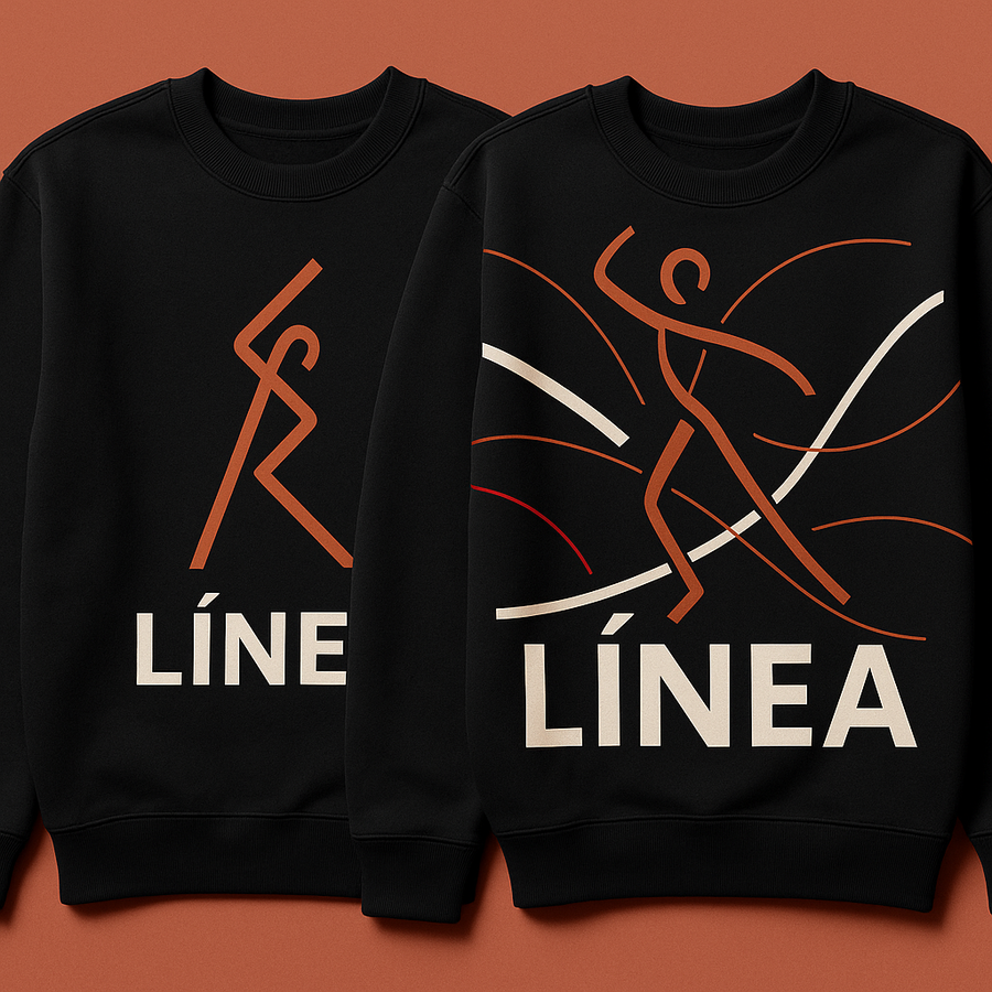 Two minimalist black cotton sweatshirts lying flat on a warm terracotta background. Printed with the LÍNEA logo in pure white and a terracotta dancer gesture made of one continuous line. Second sweatshirt includes additional dynamic arcs in terracotta, ivory, and a touch of deep red. Soft natural light, matte fabric, no reflections, fashion editorial style, calm rhythm and visual balance.