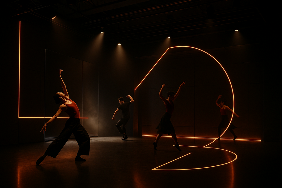 interior of a contemporary dance stage for «LÍNEA» performance in Moscow. minimalist theatrical space combining architecture, light and movement. dark graphite and terracotta palette, warm LED lines tracing geometric shapes inspired by the LÍNEA logo. dancers on stage in expressive motion, illuminated by abstract linear light compositions. atmosphere — Bauhaus meets contemporary choreography; poetic, architectural, clean yet emotional. materials: matte black walls, metal structures, glass light surfaces, subtle fog for light beams. high-resolution cinematic photography, dramatic yet minimalist composition.