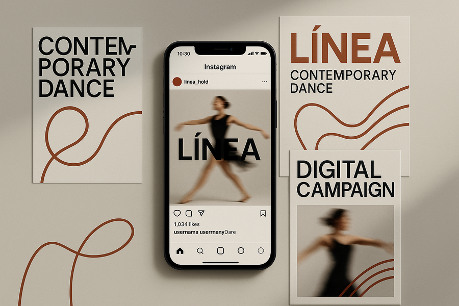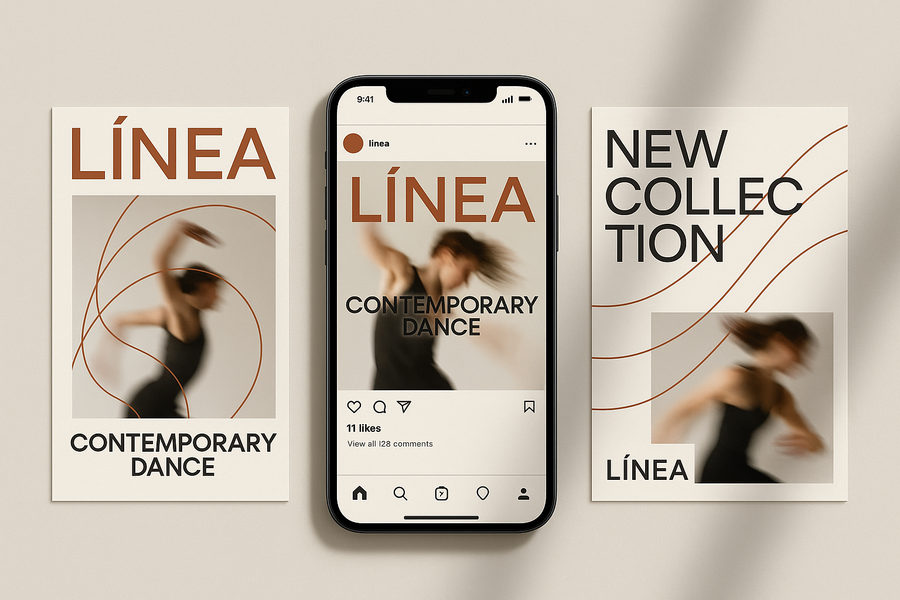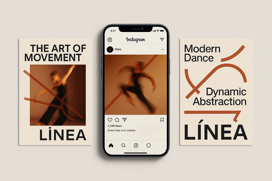 digital campaign presentation for contemporary dance brand «LÍNEA» (keep acute on Í). central smartphone mockup showing an Instagram post, surrounded by two additional flat post cards (no mockups) on neutral background. minimalistic editorial layout — clean, geometric, Bauhaus-inspired. posts feature dynamic typography, abstract terracotta line graphics, and expressive blurred dance photography; text in English. color palette: terracotta A64B36, graphite 1A1A1A, warm gray E5E1DC, white FFFFFF. soft studio lighting, high-resolution, elegant shadows, museum-like aesthetic. Do not: use glossy reflections, commercial stock imagery, or loud gradients — keep it flat, clean, kinetic, architectural.