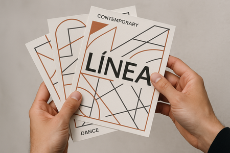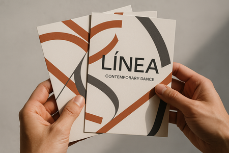 realistic photo of a person holding printed flyers for contemporary dance brand «LÍNEA» (keep acute on Í). minimalistic editorial-style composition — close-up of hands holding 2–3 flyers, partially overlapping. flyers feature brand design: terracotta and graphite geometric lines, large modern grotesk typography, abstract motion-inspired layouts. Visual mood: architectural, elegant, kinetic — a tactile moment of design and human touch. Color palette: terracotta A64B36, graphite 1A1A1A, warm gray E5E1DC, white FFFFFF. flyers printed on matte paper with slightly textured surface, no gloss. background: soft neutral (studio light gray or concrete texture), shallow depth of field, hands in natural light. style: high-end editorial photography, fashion-like realism, no heavy branding or props — focus on paper, design and gesture. no 3D mockup reflections, no excessive perspective — clean, real, minimalist.