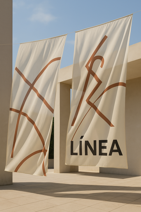 outdoor art installation for «LÍNEA»: large translucent fabric banners with terracotta line graphics gently moving in the wind, minimal architectural setting, natural light, poetic motion, Bauhaus-inspired kinetic elegance.