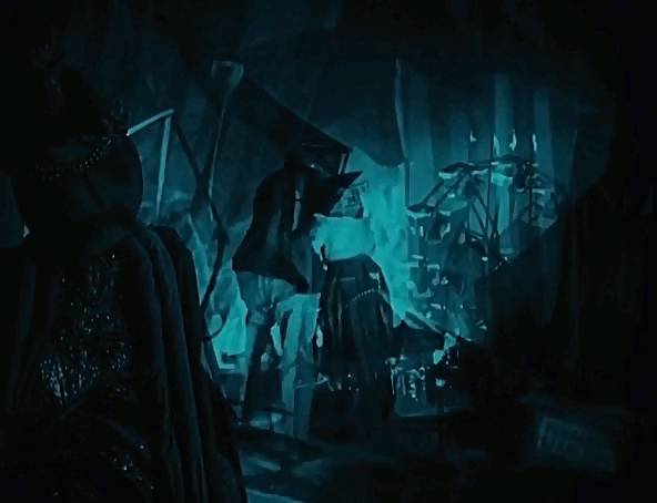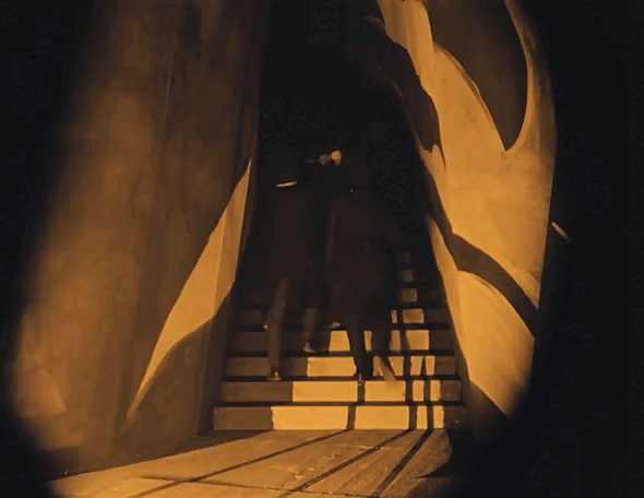 Для меня одним из наиболее выразительных визуальных деталей «Кабинета доктора Калигари» является постоянное движение персонажей в сторону искажённых, перспективно уходящих точек, которые не столько создают глубину пространства, сколько обозначают его исчезновение. Эти точки ухода существуют в фильме не как реальная отдаленность или обещание продолжения пространства, а как поглощающие элементы, за которыми нет никакого мира, нет ничего.