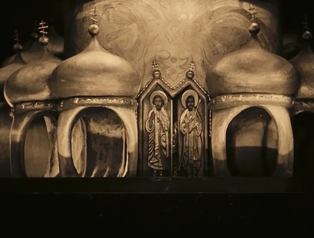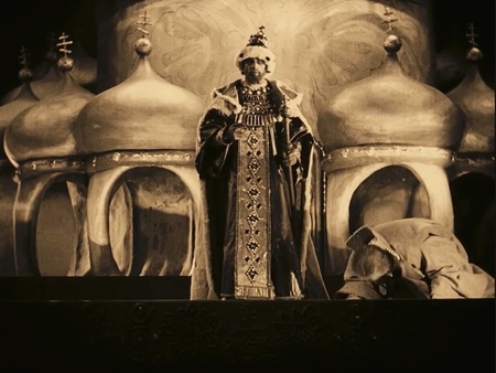 Во второй части особенно выразителен контраст между масштабом героя и масштабом окружающей архитектуры. Иван Грозный изображён преувеличенно крупным, массивным, тогда как церкви и постройки позади него выглядят миниатюрными, почти игрушечными.