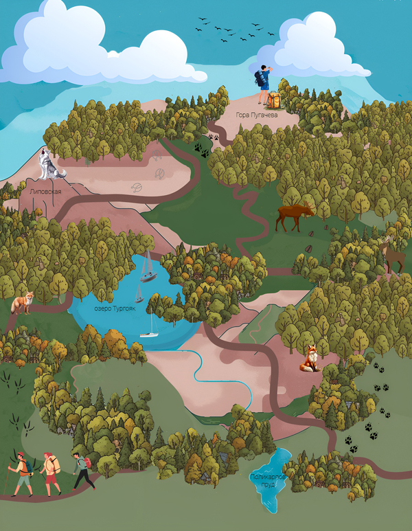 Перед вами — карта-проводник в мир уральской природы. Внимательный взгляд различит на ней следы местных обитателей, узнает о примечательных уголках ландшафта и найдёт сеть троп, чтобы спланировать собственный незабываемый маршрут.