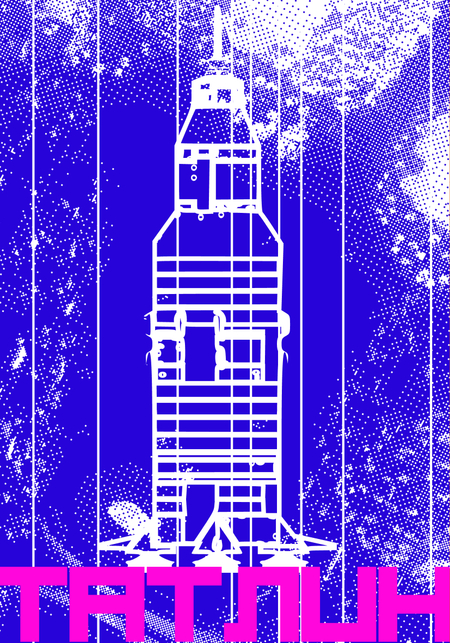 Этот плакат переосмысливает символ прогресса — ракету — через призму конструктивистской эстетики Татлина. Ракета здесь — не просто технический объект, а метафора напряжённой энергии, вертикального стремления вперёд.