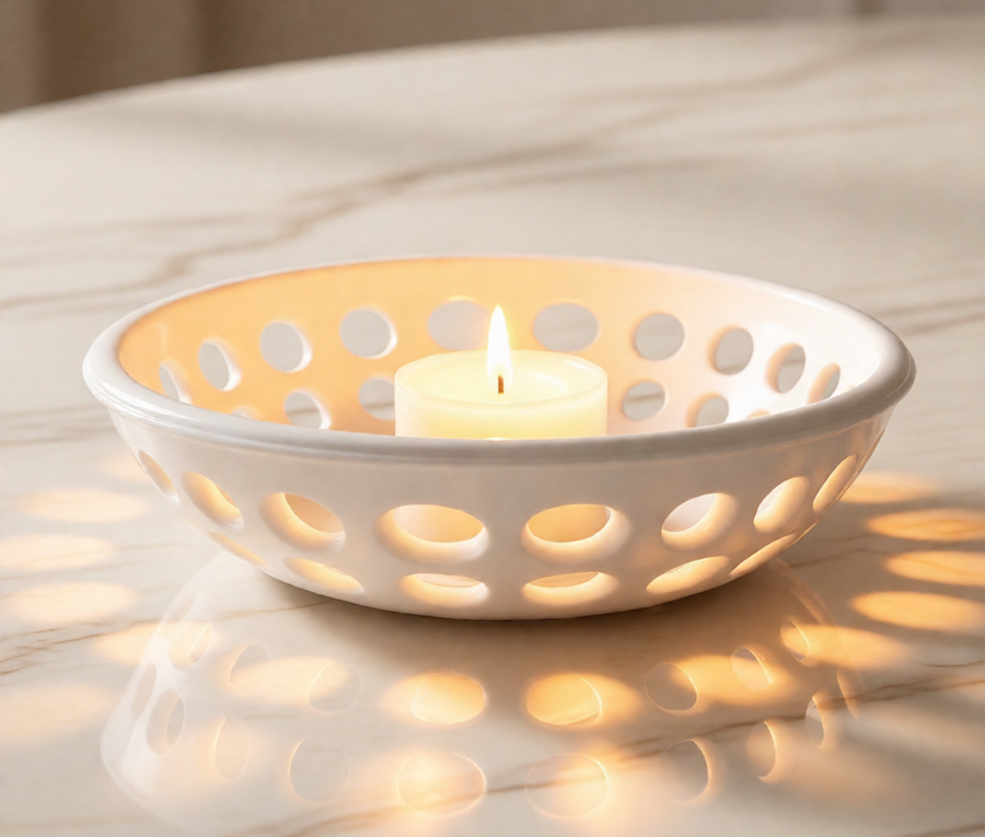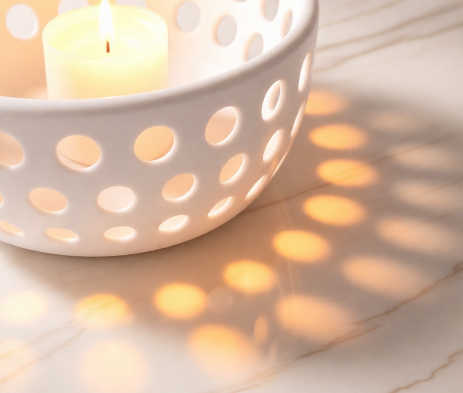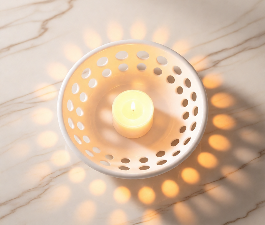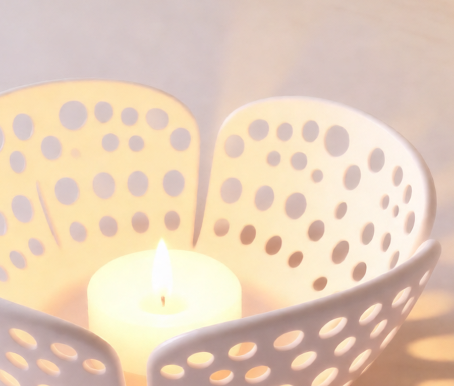 «Тепло» — пять подсвечников из плотного пластика, собранных в серию. Каждое из изделий отражает цветочные мотивы, а техника выполнения с перфорацией позволяет пропускать теплый свет свечи во все стороны.