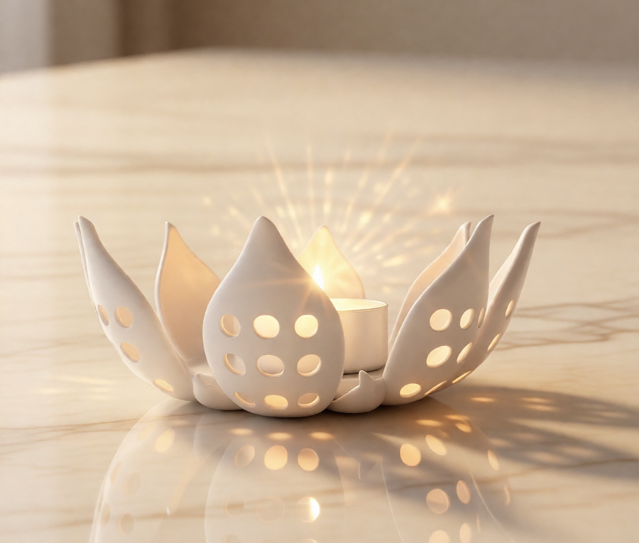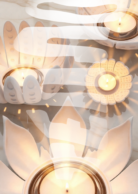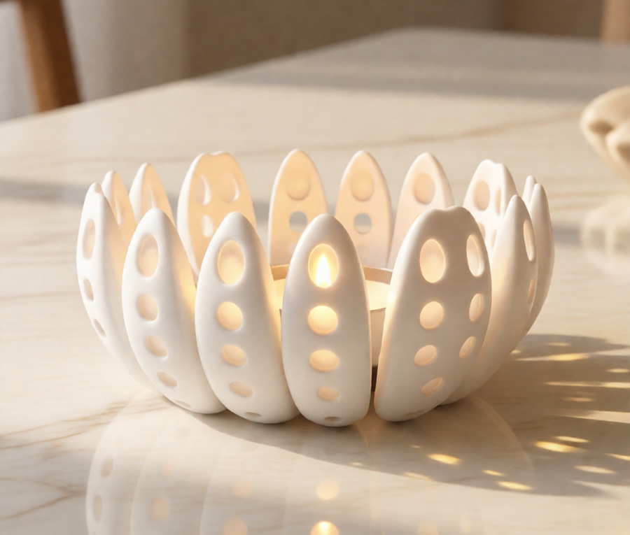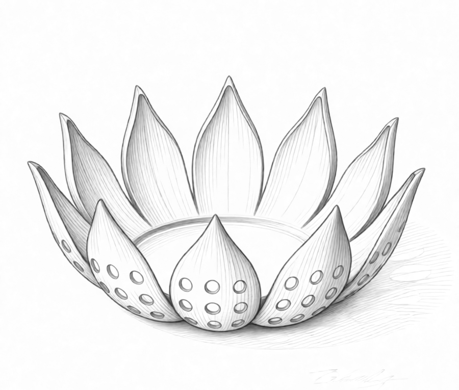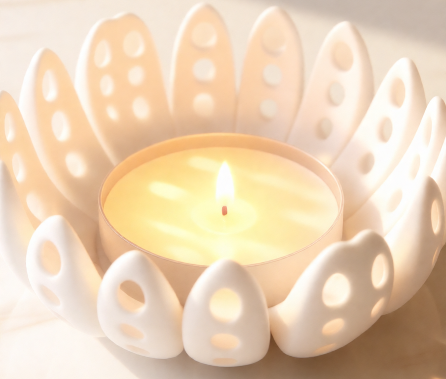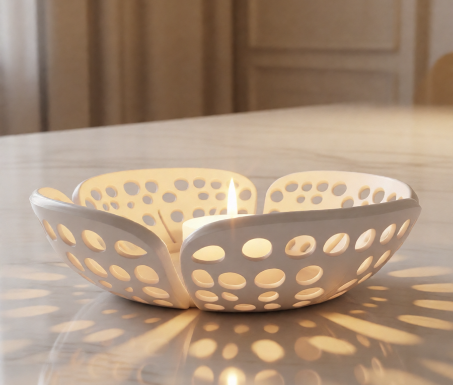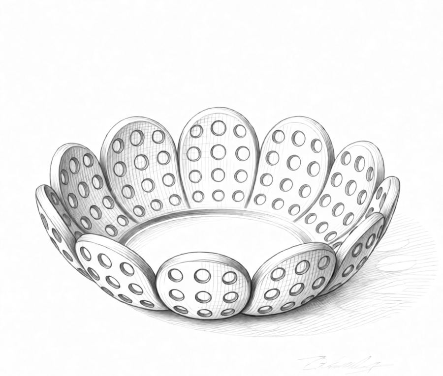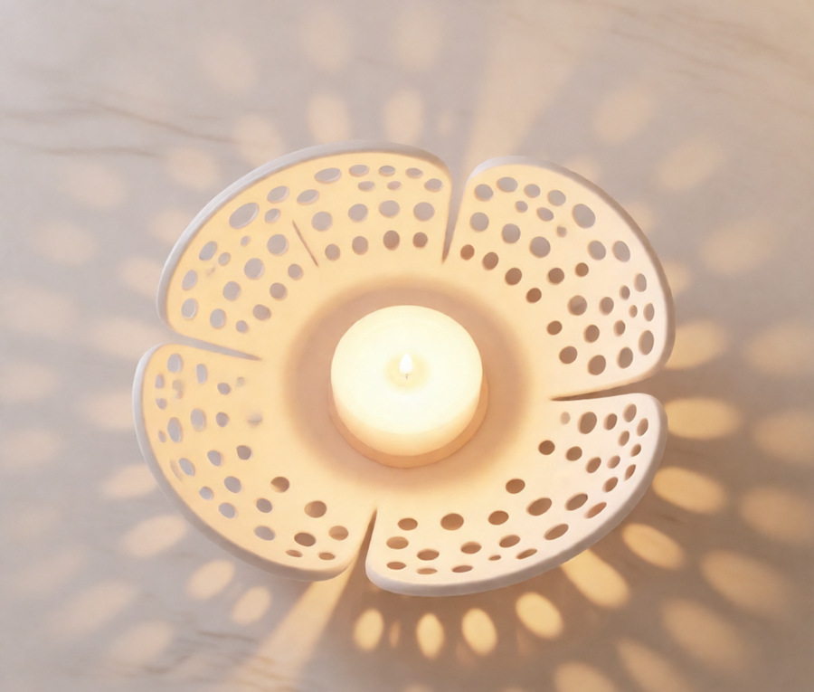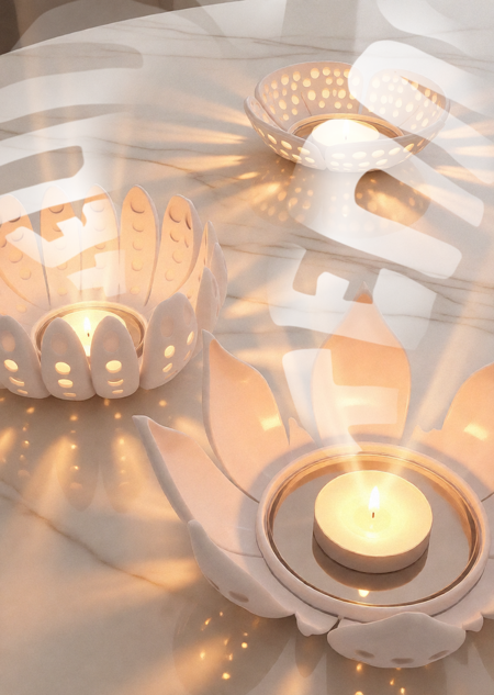 Эскизы были оформлены с помощью новой функции генерации изображений ChatGPT, а позже отредактированы в Qwen.ai. Промпт соответствует задаче проекта — создать серию из объектов-подсвечников, оформленых в цветочном стиле. Некоторые походят на индийские лотосы, некоторые — на ромашки. Только один экземпляр серии как нераскрывшийся бутон остается простым и незамысловатым по свеой форме.