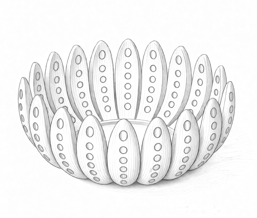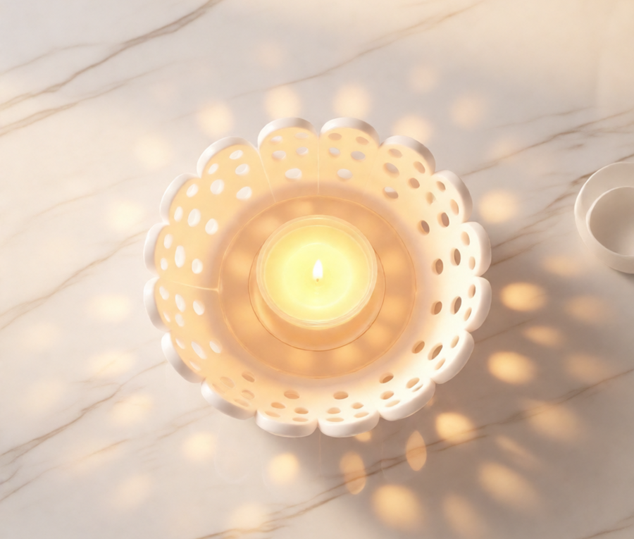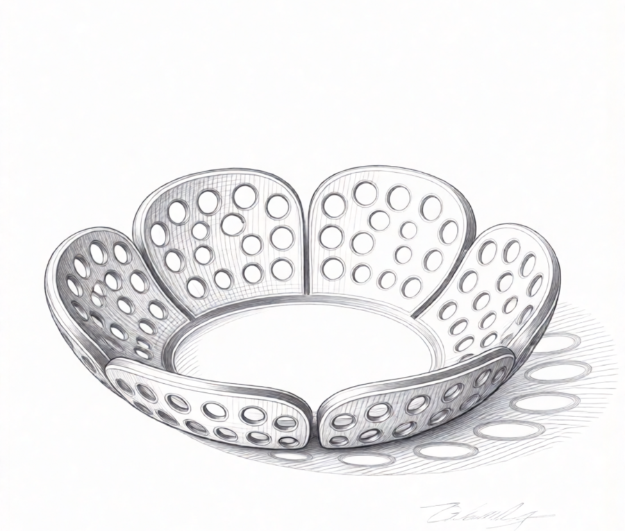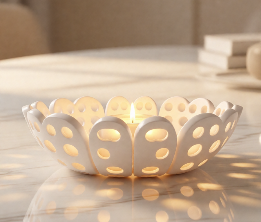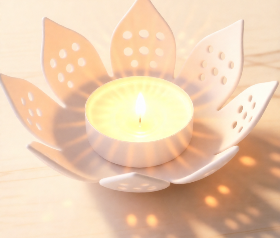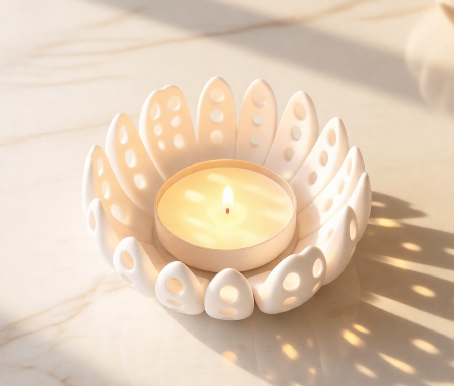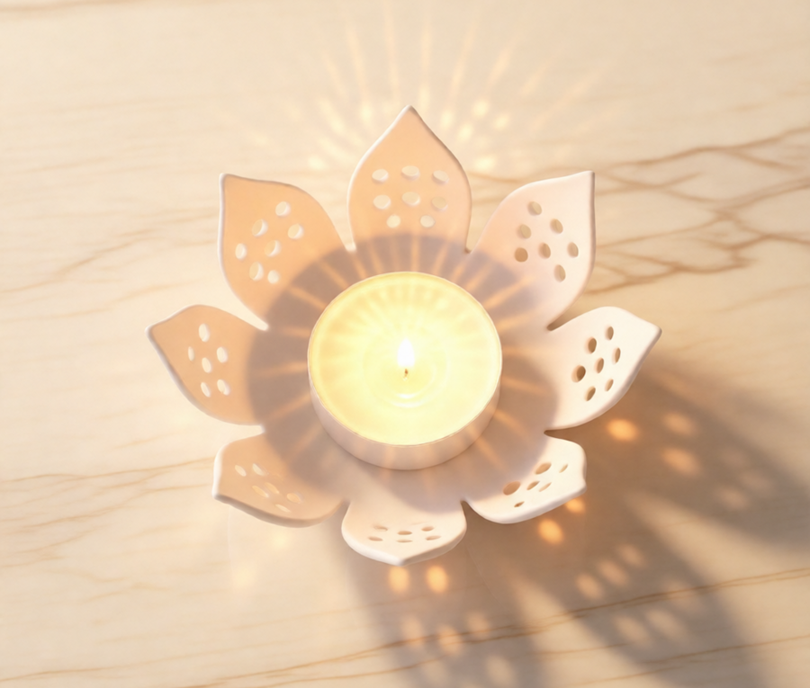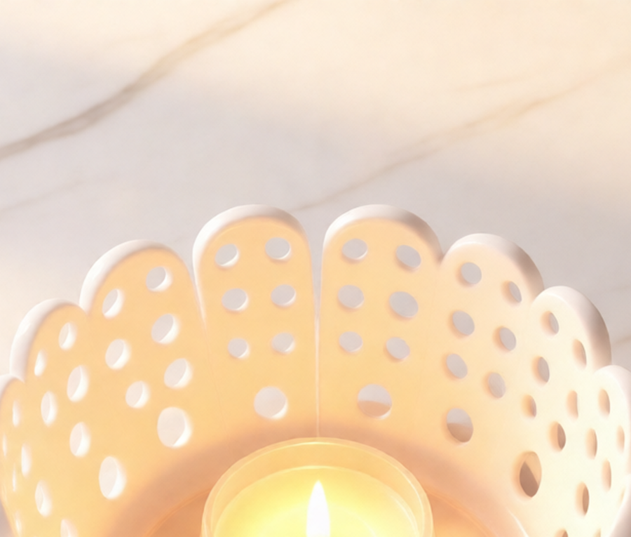 Эскизы были оформлены с помощью новой функции генерации изображений ChatGPT, а позже отредактированы в Qwen.ai. Промпт соответствует задаче проекта — создать серию из объектов-подсвечников, оформленых в цветочном стиле. Некоторые походят на индийские лотосы, некоторые — на ромашки. Только один экземпляр серии как нераскрывшийся бутон остается простым и незамысловатым по свеой форме.