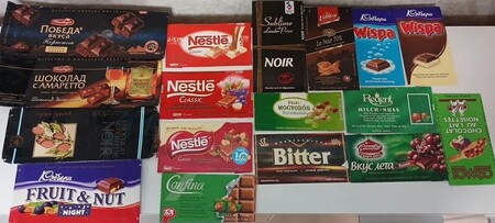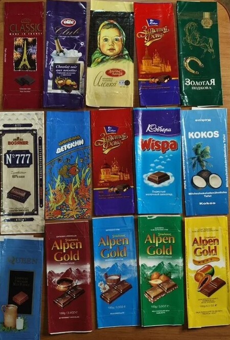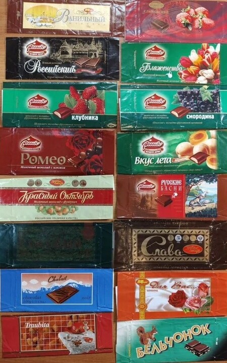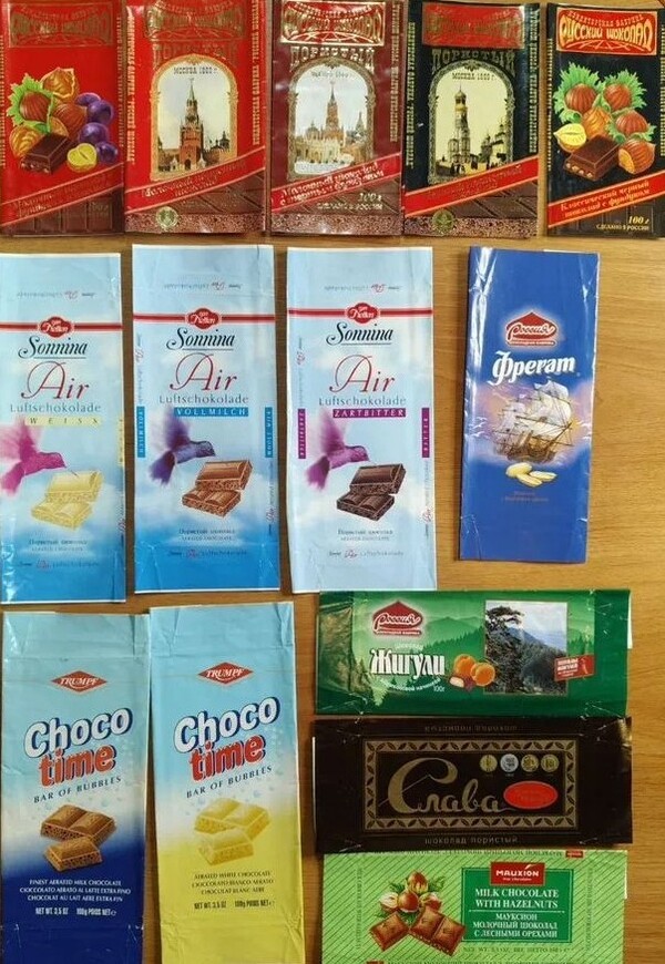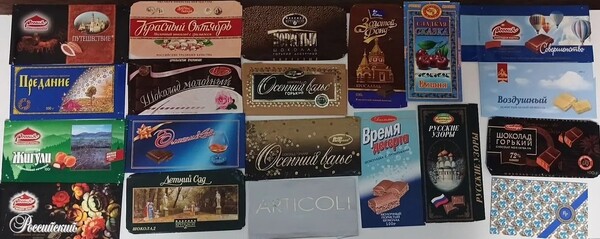 упаковка шоколада у разных компаний: «Россия», «Chalait», «Traubita», «Бельчонок», «Красный октябрь»