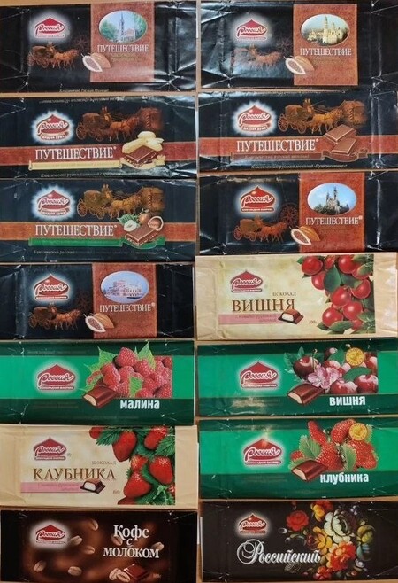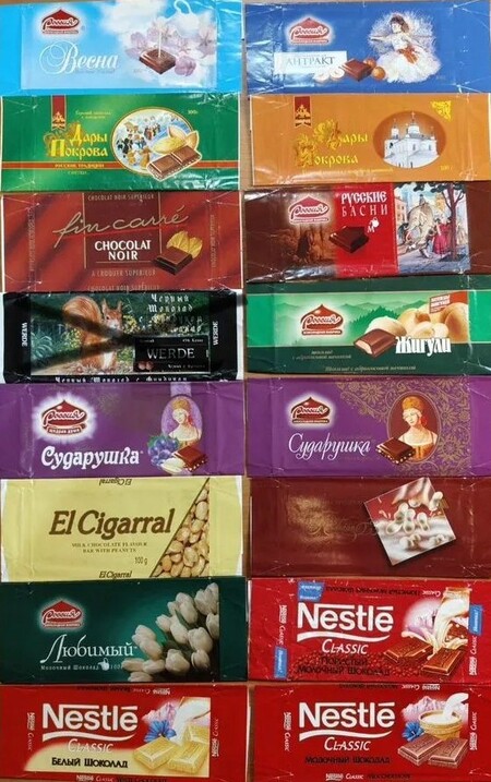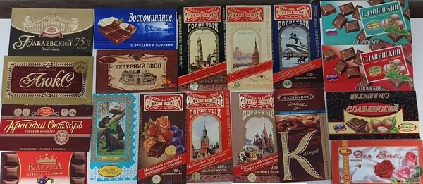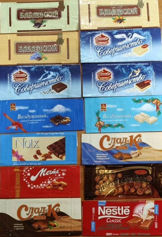 упаковка шоколада у разных компаний: «Россия», «Бабаевский», «Мечта», «Бельчонок», «Красный октябрь» и др.
