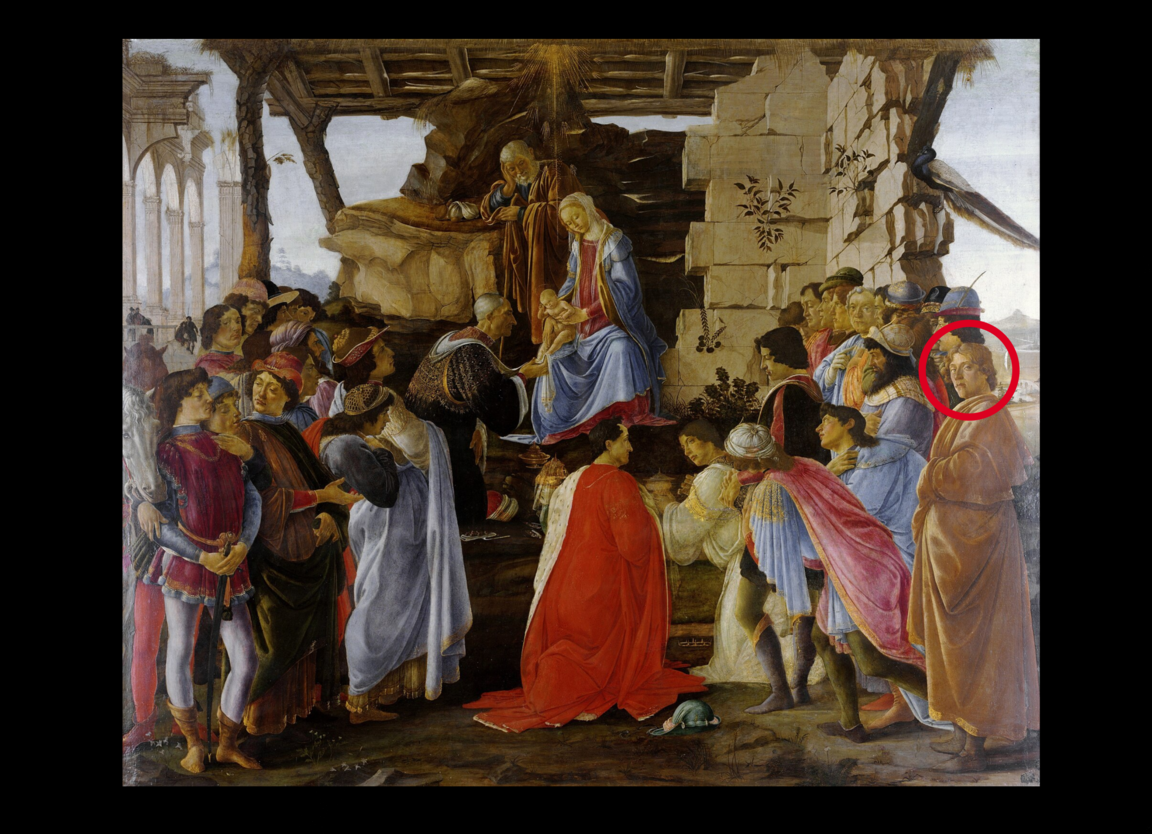 Особенно показательно «Поклонение волхвов» (1475–1482), где Боттичелли помещает себя на переднем плане композиции. Художник поворачивается лицом к зрителю и смотрит на него, вступая в прямой визуальный контакт. Его фигура как бы подтверждает присутствие наблюдателя в пространстве картины: он становится посредником между зрителем и изображённым событием, словно приглашая войти внутрь повествования. Эта новая манера взаимодействия усиливает значимость зрительского взгляда: пространство картины предполагает активного, осознающего себя наблюдателя.
