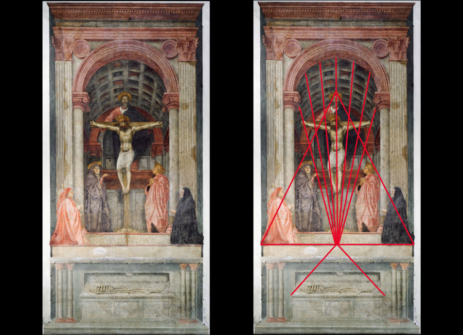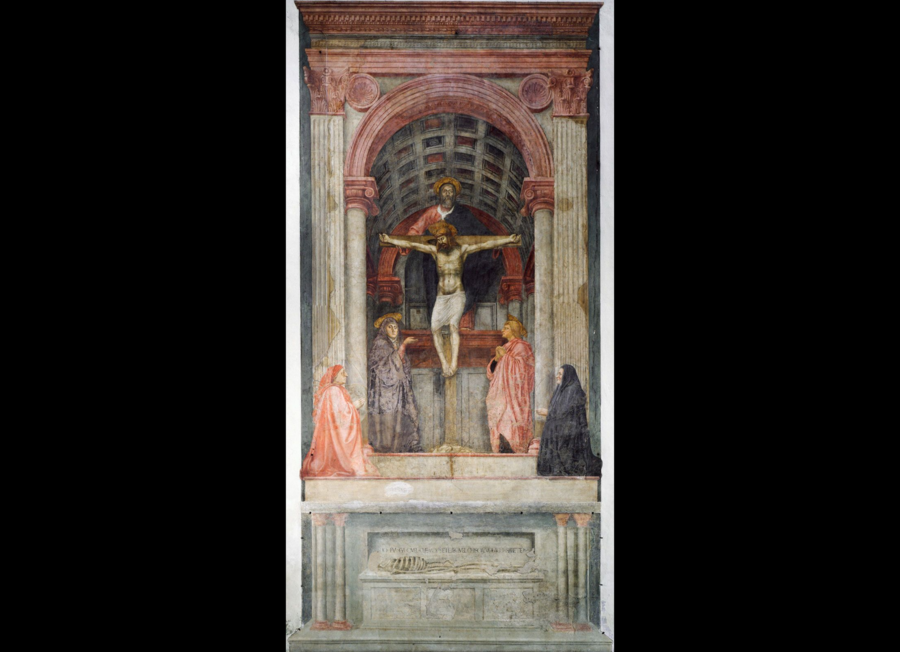 Одним из первых произведений, демонстрирующих принципиально новый подход, является фреска Мазаччо «Троица» (ок. 1427) в церкви Санта-Мария-Новелла.