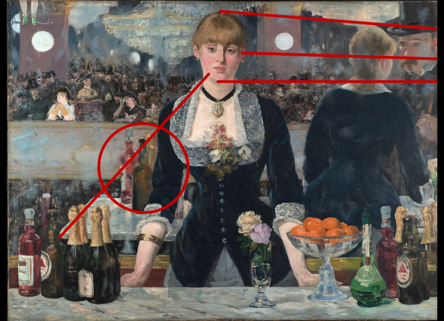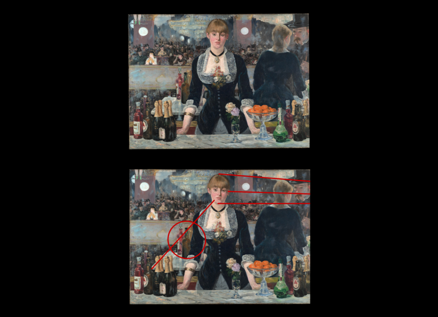 Его картина «Бар в Фоли-Бержер» (1882) — один из наиболее ярких примеров того, как художник начинает работать не с фиксированной перспективой, а с множественностью взглядов. На полотне мы видим барменшу, стоящую перед зрителем, но её отражение в зеркале искажено и сдвинуто, так что мужчина, с которым она разговаривает, оказывается в левом крае композиции. Это создаёт ощущение визуального парадокса: зритель одновременно находится перед сценой и внутри отражённого пространства. Мане использует зеркало как инструмент, позволяющий разрушить стабильную точку зрения, и тем самым создаёт напряжение между «тем, что видит глаз», и «тем, что должно быть изображено». Такой приём меняет роль зрителя: он уже не просто наблюдатель с фиксированной оптической позиции, а участник сложной, оптически нестабильной ситуации, где его собственный взгляд становится частью интерпретации.