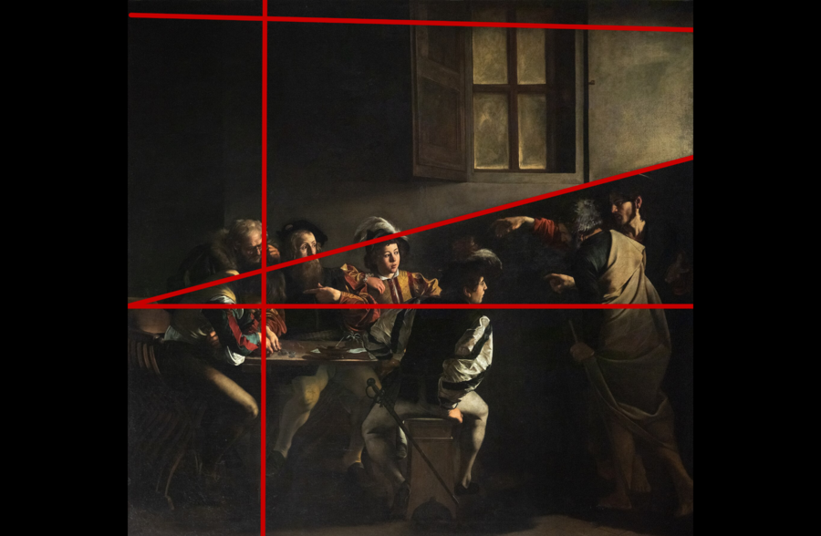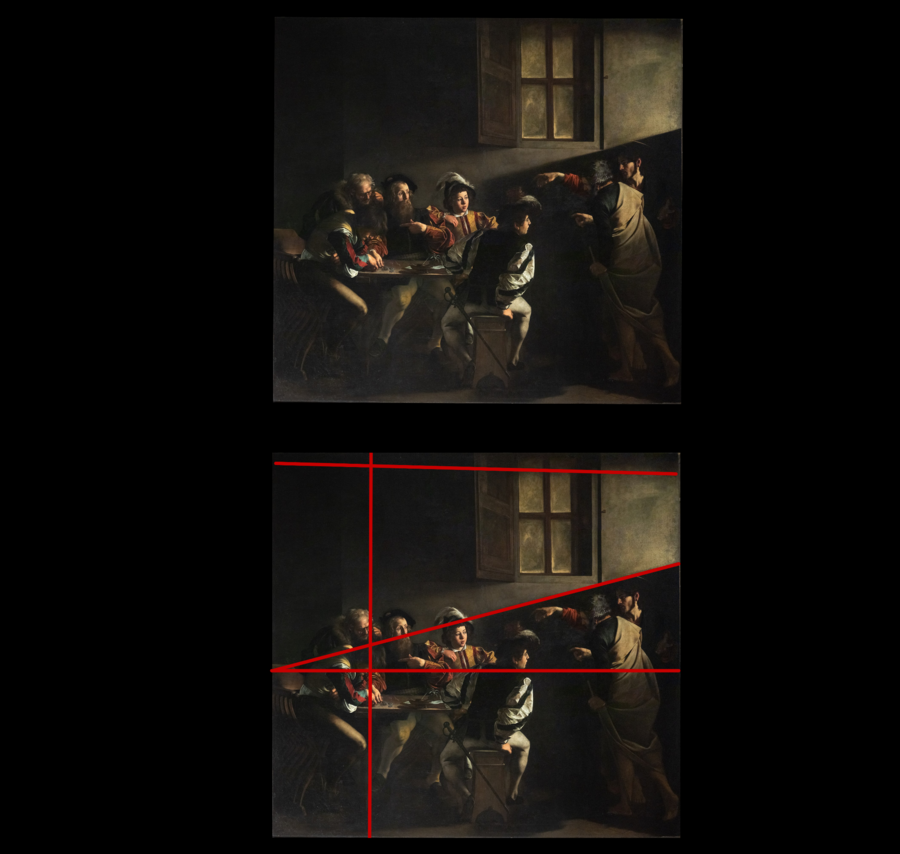 В этой картине свет — главный инструмент включения зрителя. Луч света, падающий на Матфея, имеет реальное направление, совпадающее с тем, откуда исходит свет в самой капелле Контарелли, для которой создана работа. Иными словами, Караваджо использует архитектурное освещение для создания ощущения единства пространства картины и пространства реального помещения. Картина расположена на боковой, левой стене капеллы и приближающийся к ней видит всю композицию в сильном ракурсе, который совпадает с повелительным жестом руки Иисуса Персонажи сидят за столом так, что создаётся впечатление, будто зритель стоит рядом, в границе тёмного помещения. Караваджо делает зрителя свидетелем момента выбора, в котором он как будто должен сам принять решение.