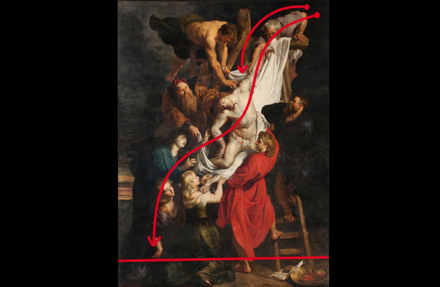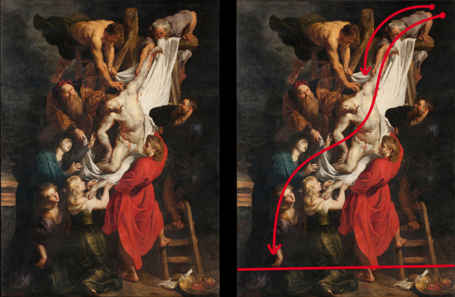 Здесь артистичность барокко достигает своего максимума: диагонали композиции создают мощное ощущение физического движения, которое буквально вырывается за пределы картины. Тела персонажей расположены так, что кажется, будто они выходят в пространство зрителя. Особенно выразителен жест мужчины, держащего тело Христа: он направлен вперёд и вниз — прямо в сторону наблюдателя. Композиция не просто раскрывается навстречу зрителю, но и давит на него своей тяжестью и эмоциональной интенсивностью. Вовлечённость здесь происходит через драму и ощущение физического присутствия. Рубенс превращает наблюдателя в очевидца — человек как будто стоит у подножия креста, ощущая вес происходящего.