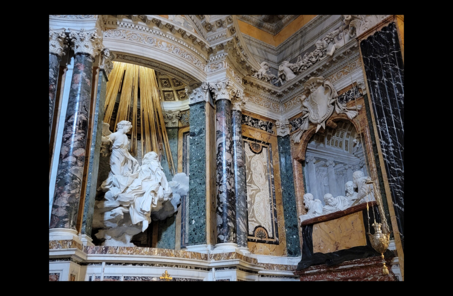 Хотя это не живописное произведение, оно идеально отражает барочную модель взаимодействия с восприятием. Бернини создает не просто статую, а сцену, которая существует только во взаимодействии с архитектурой капеллы Корнаро и её зрителем. Свет, падающий сверху, — реальное освещение, превращающее скульптуру в театральное действие. Позолоченные лучи создают эффект вмешательства небесного присутствия в земное пространство капеллы. Кроме того, по бокам композиции Бернини помещает ложи с фигурами членов семьи Корнаро, наблюдающих за сценой — словно театральная публика. Этот жест показывает принципиально новое отношение к зрителю: он не просто наблюдает, он становится частью ритуала наблюдения. Его взгляд — продолжение взглядов тех, кто изображён.