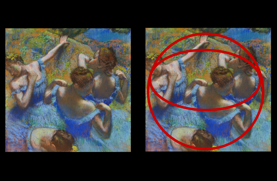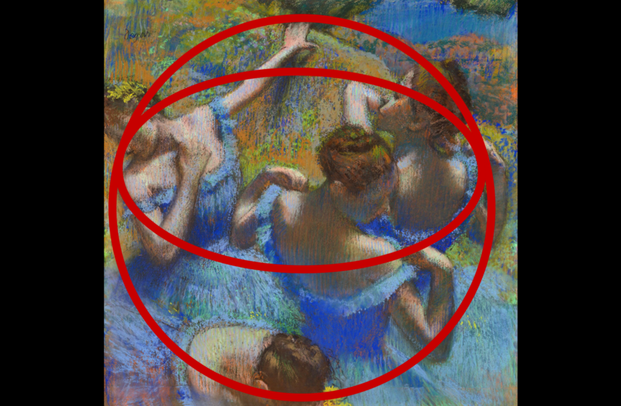 Картина «Голубые танцовщицы» (1897-е) предлагает зрителю необычное композиционное решение: перед нами не фронтальная сцена балета, а словно мимолётный взгляд за кулисы. Фигуры танцовщиц частично скрыты, обрезаны краем картины, а динамичные мазки создают ощущение движения. Дега кладёт зрителя туда, где обычно никто не стоит — на боковую позицию, за границу официального действия. Такой подход формирует новый тип зрителя: человека, который видит не «парадное» действие, а фрагмент реальности, взгляд «изнутри», наблюдение за жизни́нной ситуацией. Это ломает академическое представление о правильном ракурсе и учит зрителя воспринимать мир так, как он выглядит в живом, случайном восприятии.
