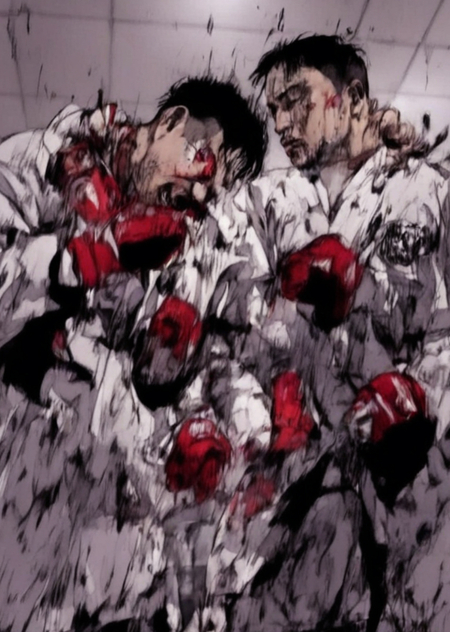 Обученная модель улавливает визуальный язык манхвы «Windbreaker»: характерный грубый линейный контур, «потрёпанная» штриховка, приглушённые серо-фиолетовые и охристые тона, плюс яркие неоновые вспышки на фоне городских сцен. В ряде изображений удачно передан уровень городской плотности — толпы, насыщенные фоны, ощущение движения и шумного мегаполиса. На мой взгляд, модель хорошо запомнила связку: молодые герои + городской сеттинг + динамичный размытый задник.