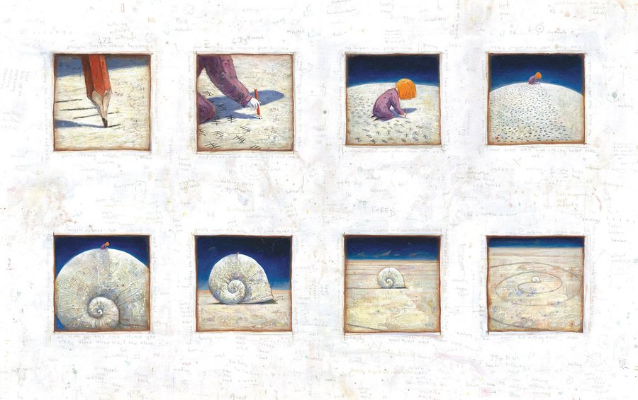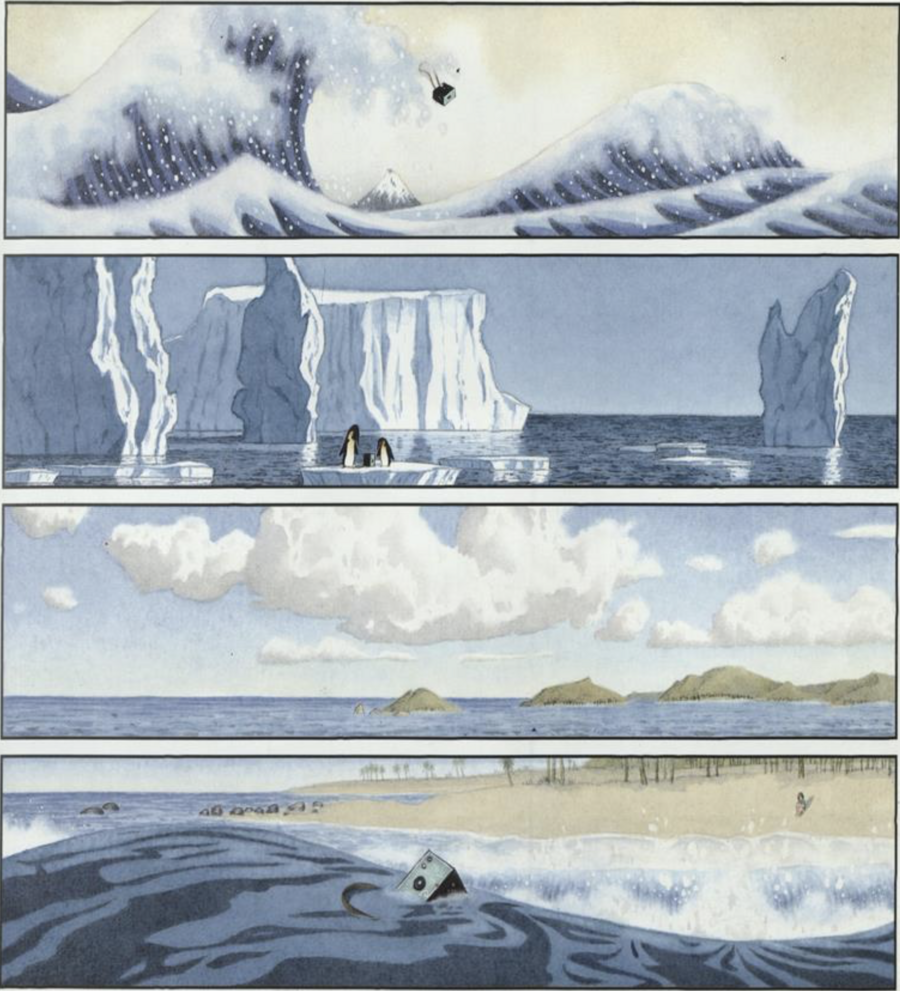 Выше приведен пример удаления объекта в кадре в книге Шона Тана «Красное дерево». Строго говоря, эту книгу нельзя назвать «тихой», так как все же она содержит некоторый текст. Но, на мой взгляд, данный пример великолепно демонстрирует здесь второстепенный характер текста — слова не объясняют происходящее, а лишь немного дополняют образ. При этом исключение текста абсолютно не меняет восприятие иллюстрации, а делает его более вдумчивым и осознанным.