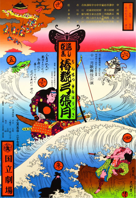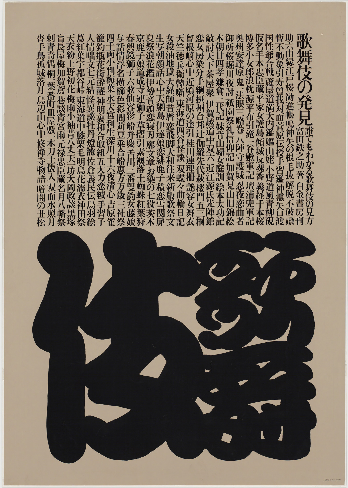 В своем известном плакате «Kanze Noh Play» Икко Танака использует изображение японской театральной маски, смешивая его с интересным типографическим решением. Композицию же плаката для театра кабуки он строит полностью из японской типографики и каллиграфии.