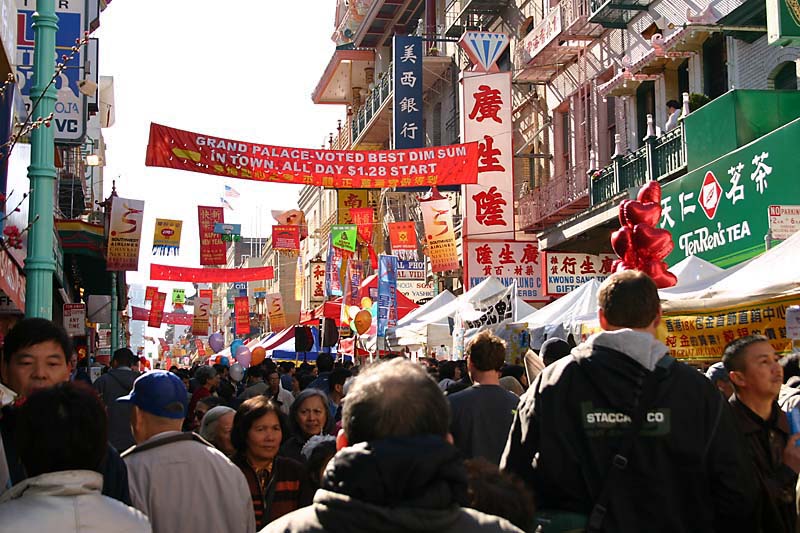 Китайские общины в США стали крайне замкнутыми из-за дискриминации. Однако на рубеже XX века эти районы были театрально переосмыслены архитекторами и градостроителями, которые никогда не были в Китае, но создавали преувеличенные версии древней китайской архитектуры — пагоды, драконьи ворота, стилизованные храмы эпохи династии Сун. [5]
