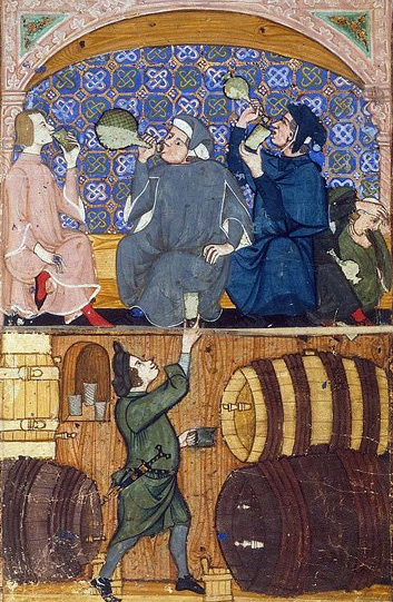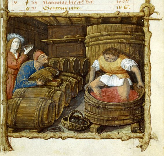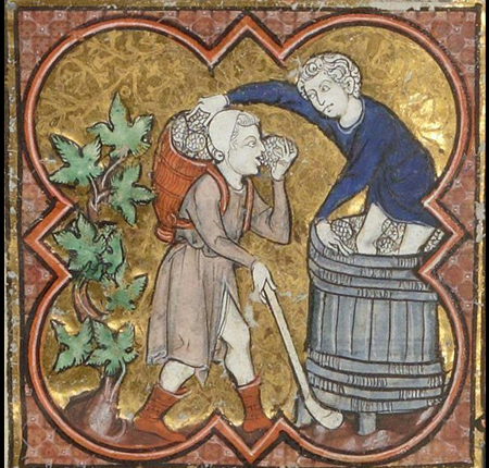 Слева: Отжим винограда. Жан де Монлюсон. около XIV в. Франция. Справа: «Грех чревоугодия». Генуа около XIV в.