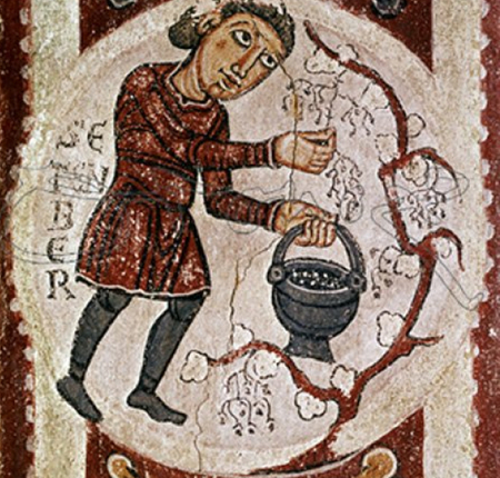 Слева: Миниатюра Сен Жермен де Пре. Франция. XIII в. Справа: «Сентябрь. Сбор винограда». Роспись в аббатстве Сан Исидоро. XII в. Испания