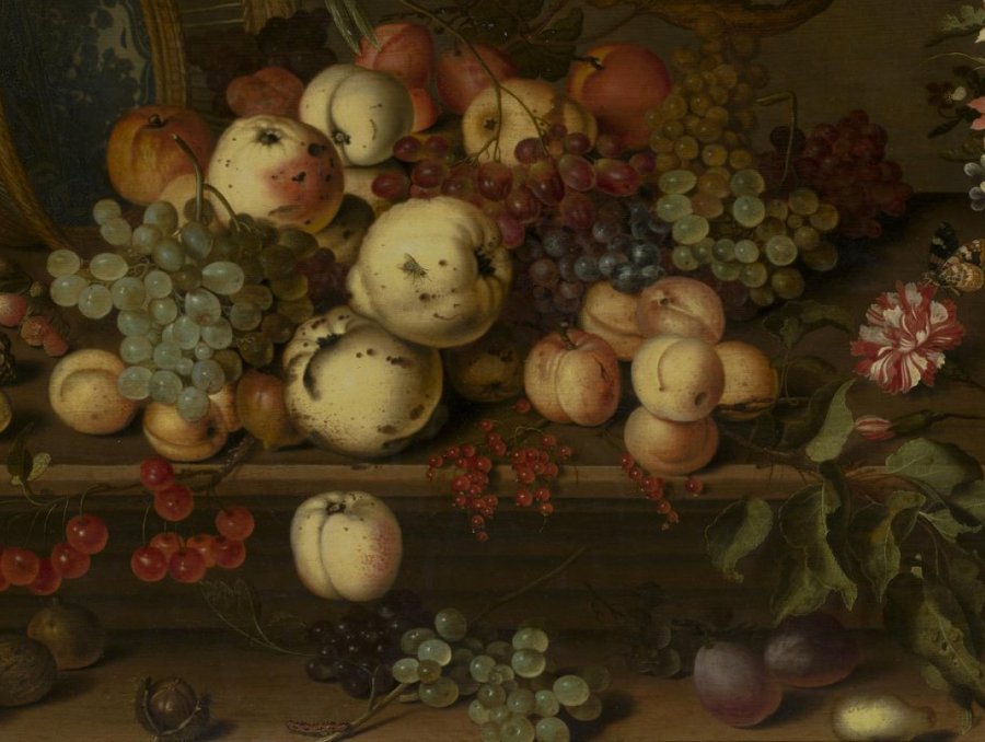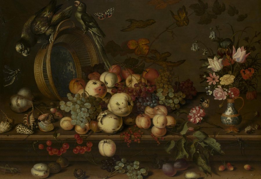 Натюрморт с фруктами, опрокинутой корзиной и букетом цветов в вазе. Аст, Балтазар ван дер. 1625 г. Голландия