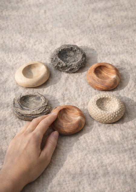 Серия Pebbly создана по мотивам природных минералов, где каждый камень передаёт уникальную текстуру и форму: гладкая полировка «Речного» напоминает отточенную водой гальку, шероховатая поверхность «Базальта» имитирует вулканическую породу, рёбра «Агата» повторяют слоистые срезы минерала, «Сланец» воплощает геологическую слоистость сглаженных плит, а сферическая «Галька» с точечным рельефом воссоздаёт округлую форму морского камня с естественными неровностями.