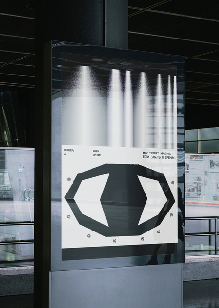 Верхняя часть плаката — градиентные вертикальные полосы, постепенно растворяющиеся из-за шума. Это символизирует постепенную потерю чёткости и яркости мира при проблемах со зрением.