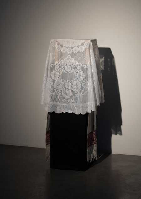 Зрителю предлагается подойти к подиуму и, погрузив руки под скатерть, взаимодействовать с единственным пластичным объектом.