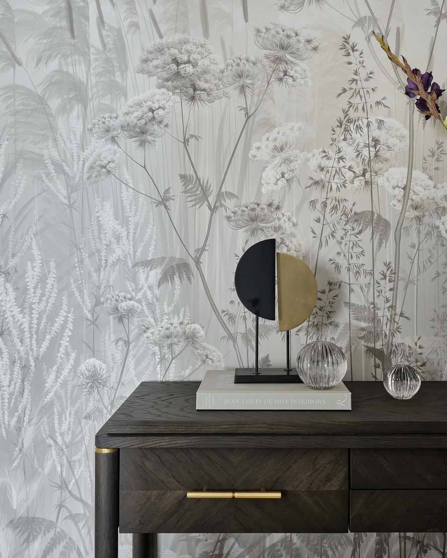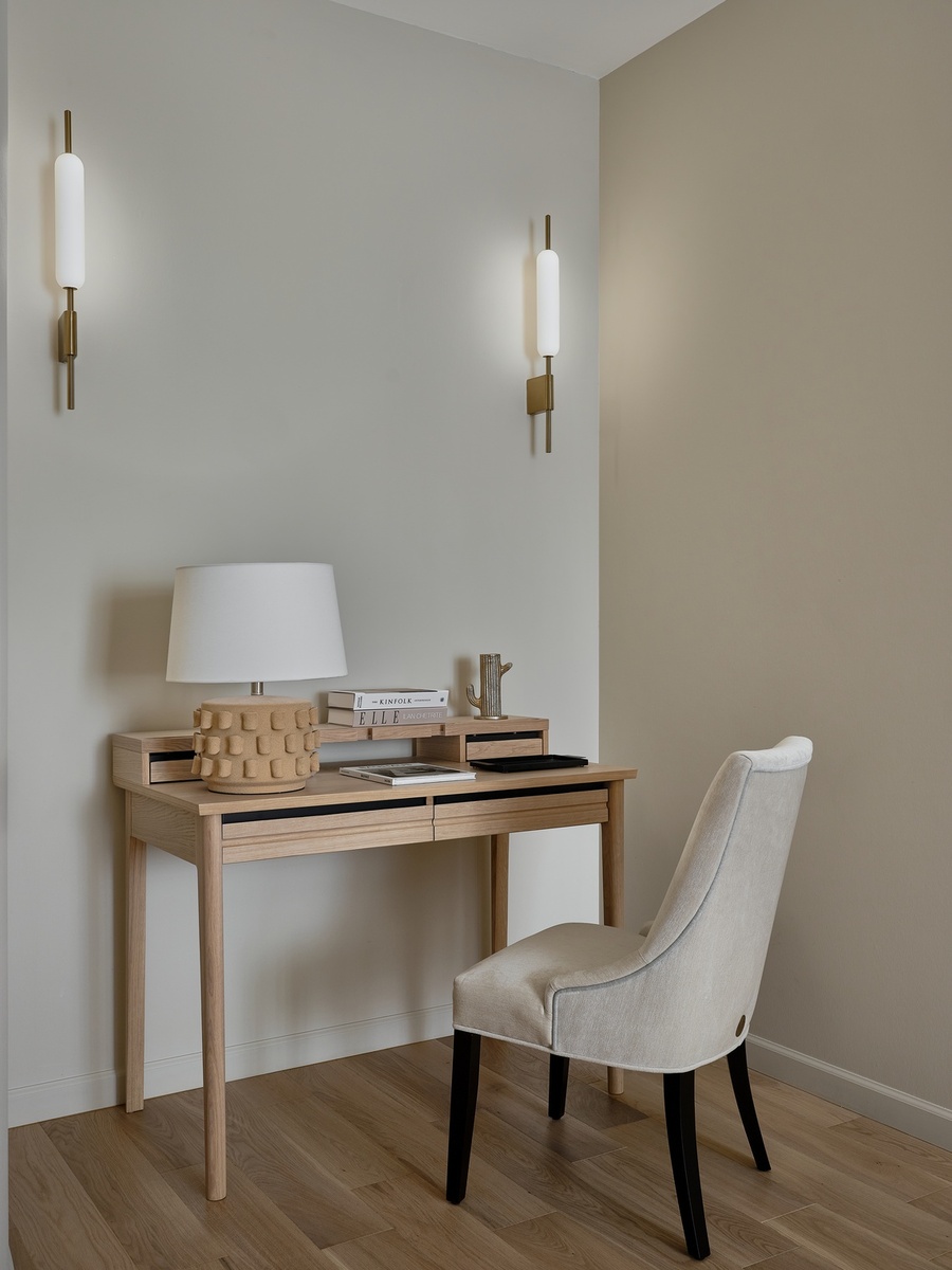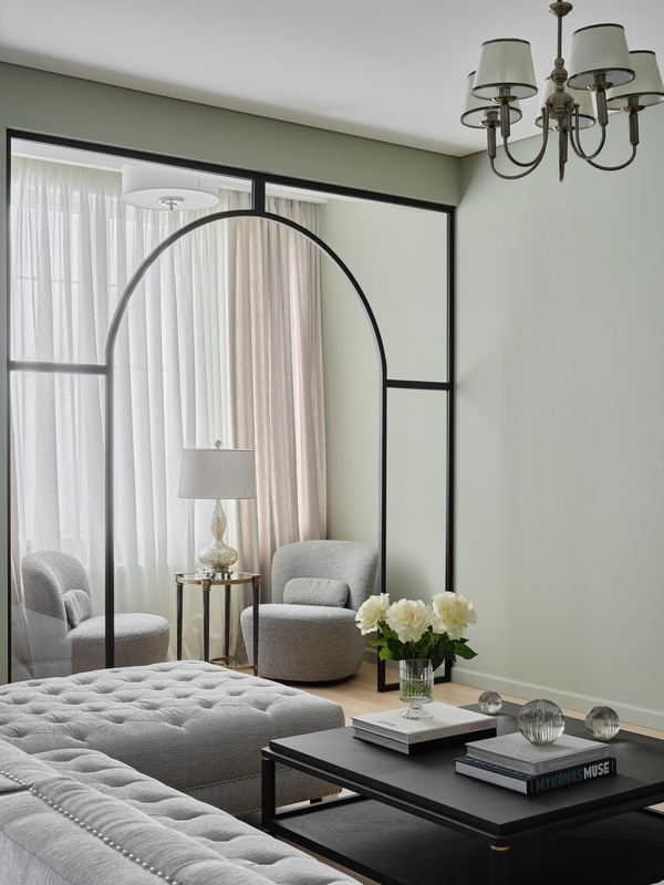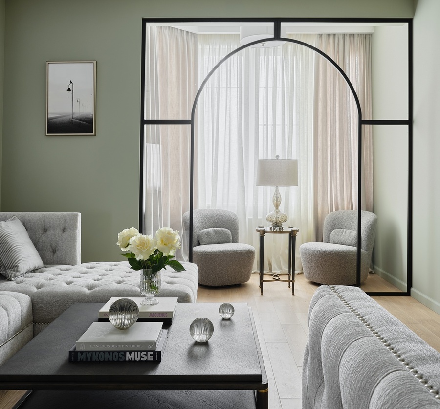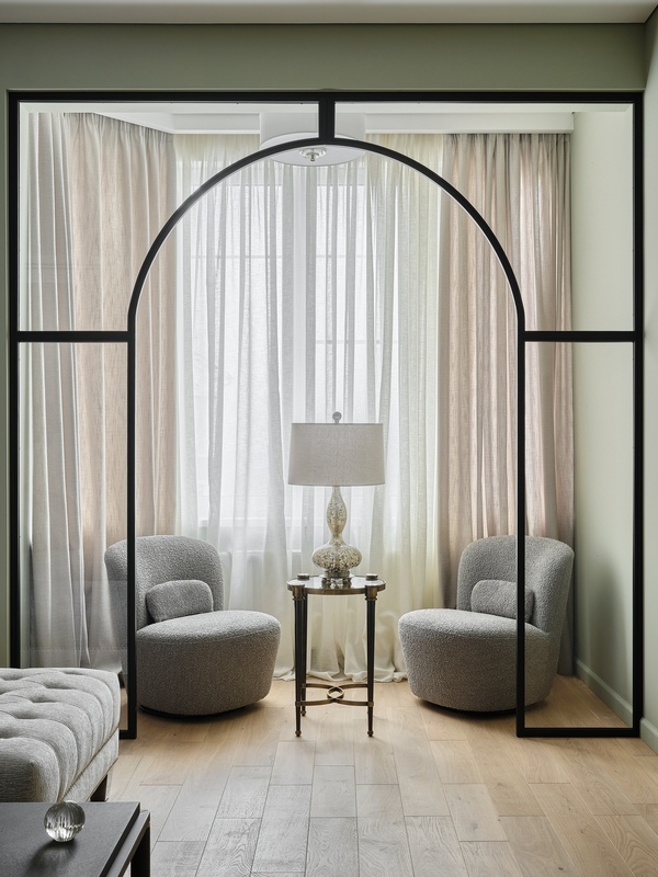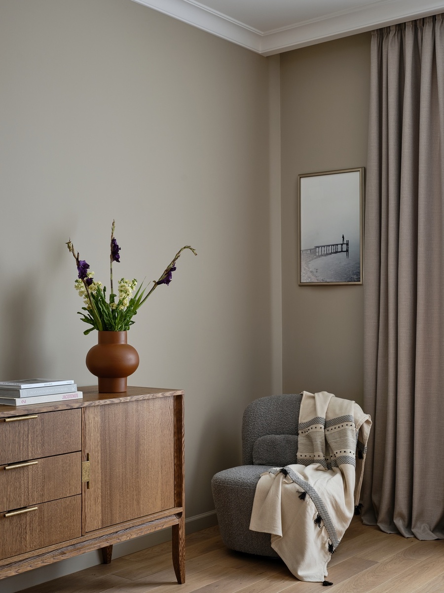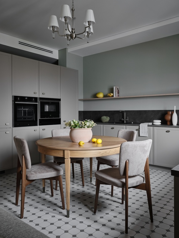 Особый шарм интерьеру придает спокойная палитра с использованием природных, земляных оттенков: зеленоватых, оливковых, древесных. Оформление строится на полутонах и мягких контрастах разных текстур — необработанного льна, теплого дерева, натурального камня, гладких окрашенных поверхностей. На полу жилых помещений — золотистый паркет, на полу мокрых зон — мелкоформатная керамическая плитка в виде ковра с декоративной окантовкой, на кухонном фартуке и столешницах — темно-графитовый камень.