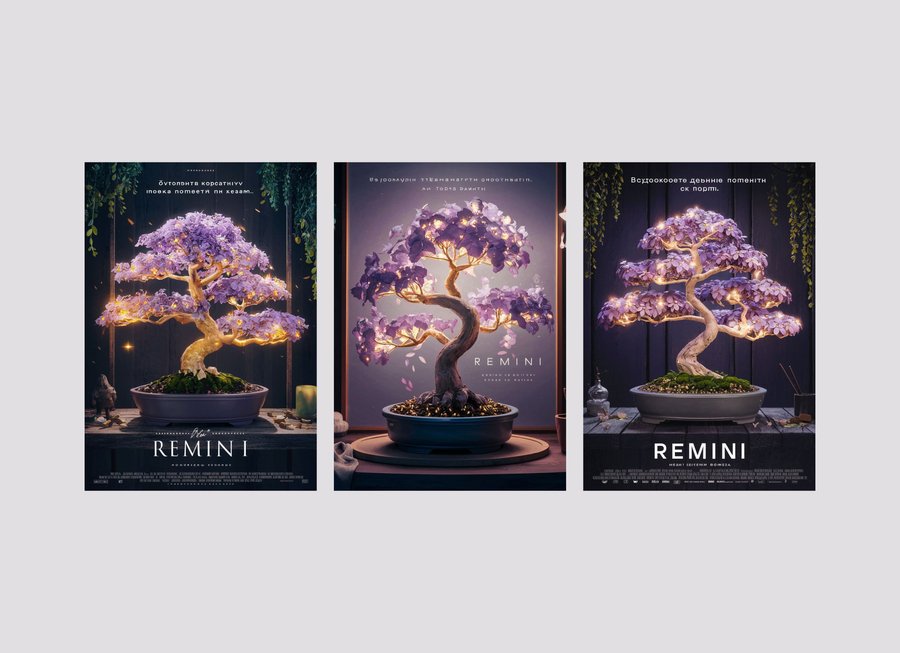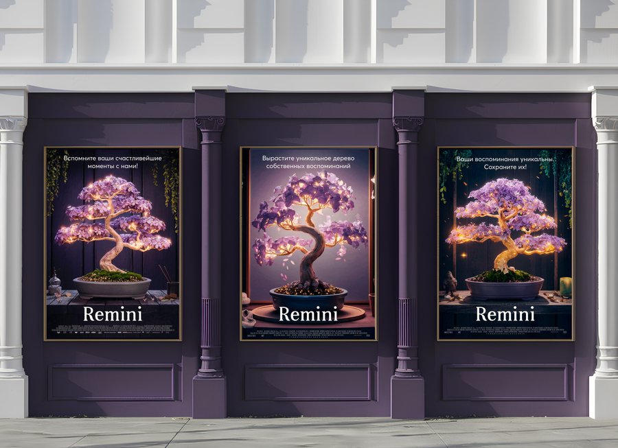 Каждое дерево Remini уникально. Форма и оттенок цветов и плодов зависят от характера хозяина растения. Именно эта черта деревьев отражена в серии плакатов. Графика для плакатов создана с помощью нейросети Ideogram, а текст отредактирован и добавлен в графическом редакторе. Мокап для размещения плакатов также сгенерирован нейросетью.