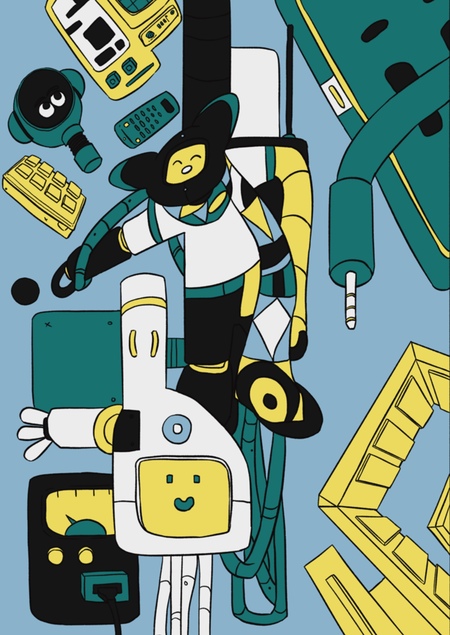 Книжные развороты, посвященные павильону ВДНХ № 2 «Робостанция». Иллюстрации демонстрируют богатый мир робототехники и компьютерных технологий, включая камео реальных роботов, находящихся на выставке. Разработка сувенирной продукции и паттерна для ВДНХ по данному павильону.