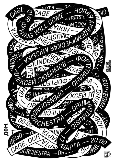 Плакат к музыкальному фестивалю «Cage. Our spring will come», проходящем в культурном центре «Дом», попал в конкурсную номинации «Музыкальный клуб» Московской международной биеннале графического дизайна «Золотая пчела» 15 и принял участие в выставке в Новой Третьяковке.
